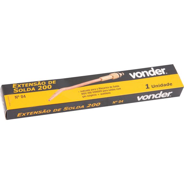 Conteúdo da embalagem 1 Extensão de solda Aplicações e dicas de uso Indicada para o maçarico de solda MSV 200 Vonder para soldas com gás oxigênio+acetileno Destaques e diferenciais Fabricada em cobre eletrolítico, proporcionando maior durabilidade, efetua a mistura dos gases internamente (injetor integrado). Atende às exigências das normas EN 5172 / NR18.