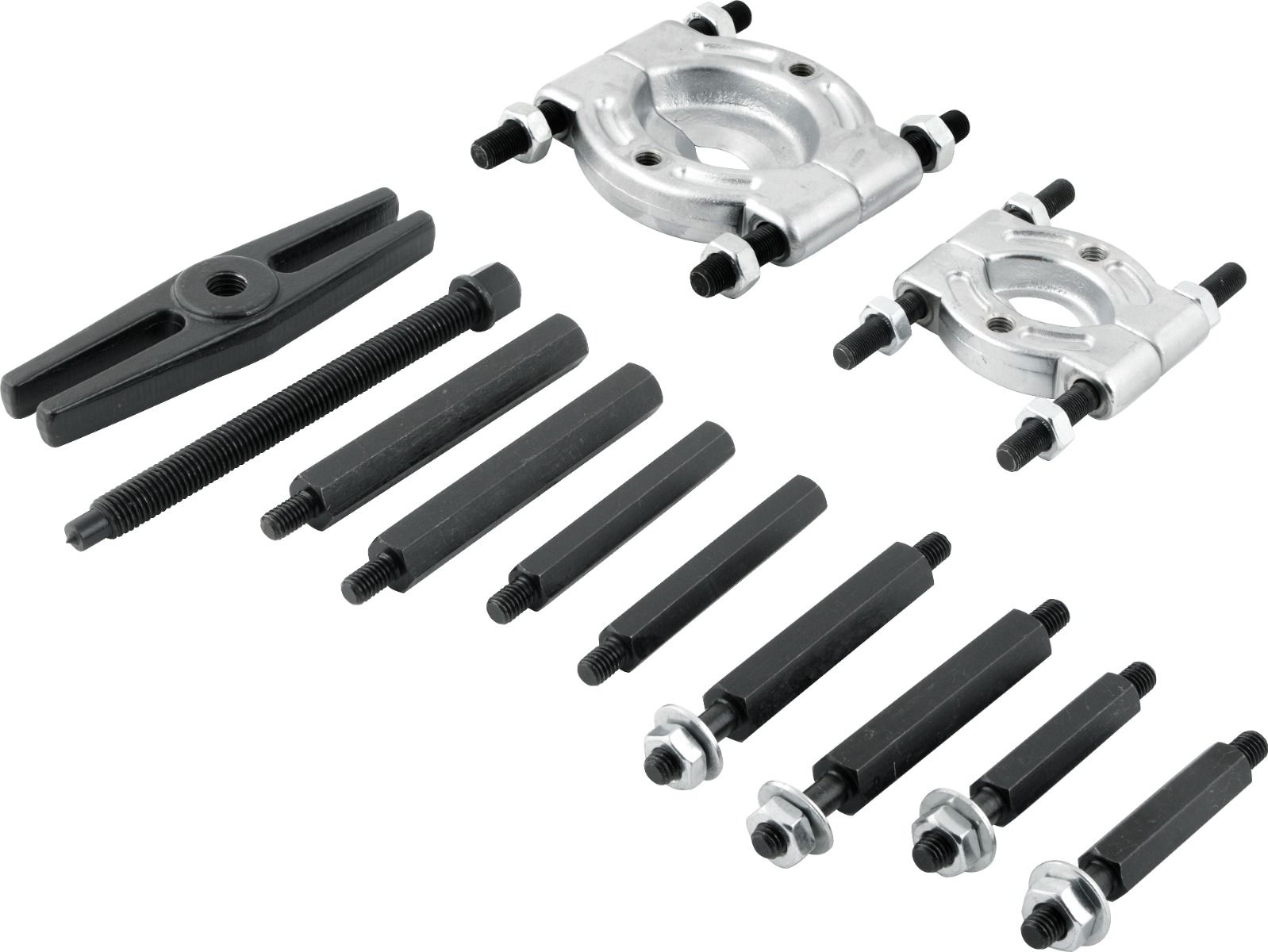 1 Conjunto extrator de rolamentos com 12 peças, sendo: 1 extrator 30 - 50 mm, 1 extrator 50 - 75 mm, 1 parafuso de impulso, 2 barras de extensão 105 mm, 2 barras de extensão 130 mm, 2 barras de conexão 105 mm, 2 barras de conexão 130 mm e 1 barra transversal tipo H.