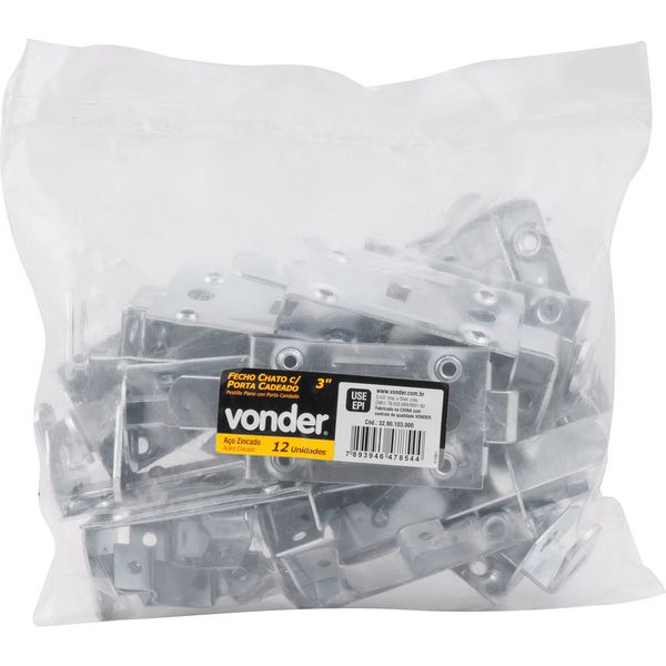 Conteúdo da embalagem 1 Pacote com 12 fechos chatos Aplicações e dicas de uso Indicado para travar portas, portões, entre outros Destaques e diferenciais Possui acabamento zincado, proporcionando maior resistência à oxidação/corrosão