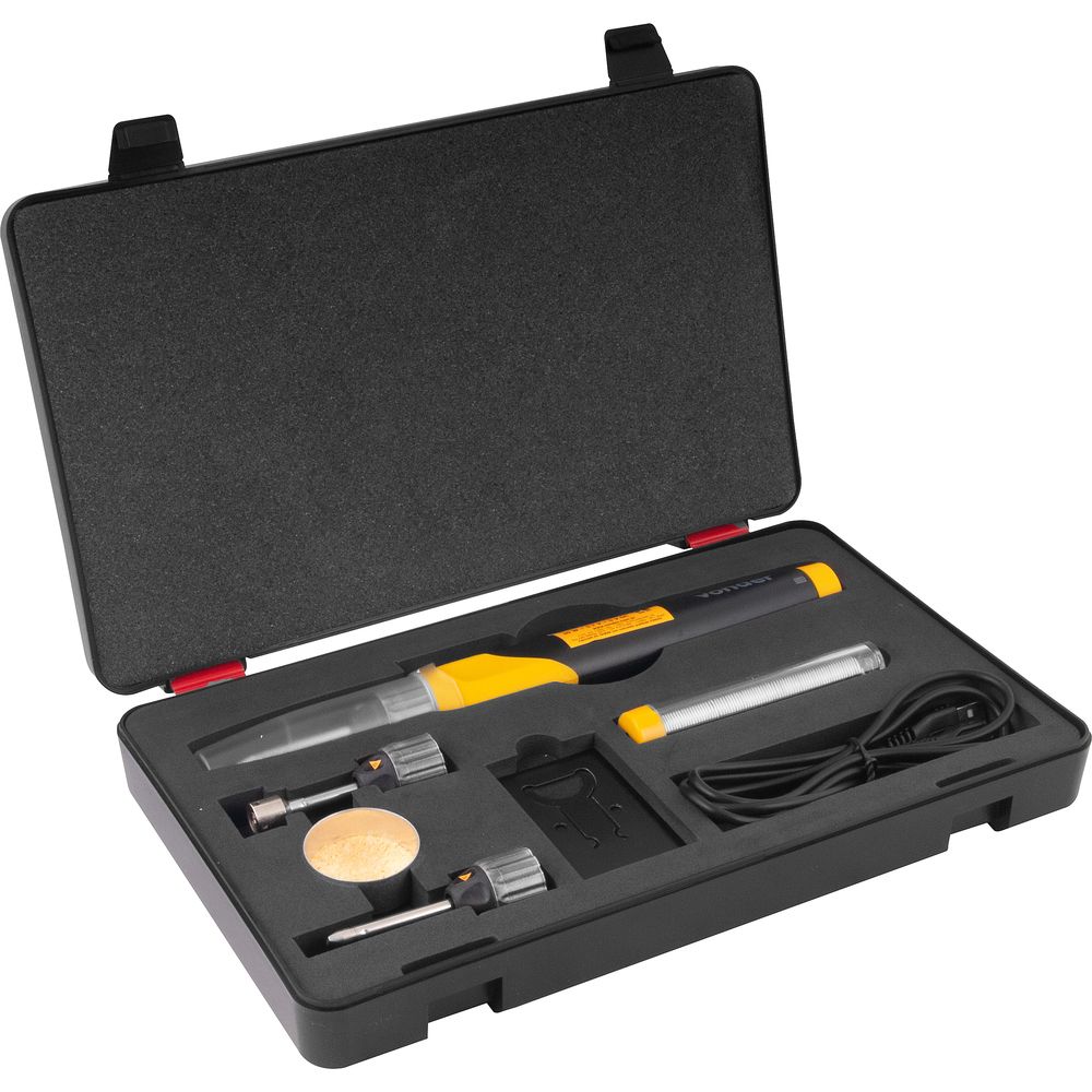 1 Ferro de solda. Acompanha: 1 ponteira cônica para solda, 1 ponteira chata para solda, 1 ponteira para aquecimento de termo retrátil, 1 rolo de estanho, 1 espuma para limpeza, 1 suporte, 1 cabo USB e 1 capa de proteção.