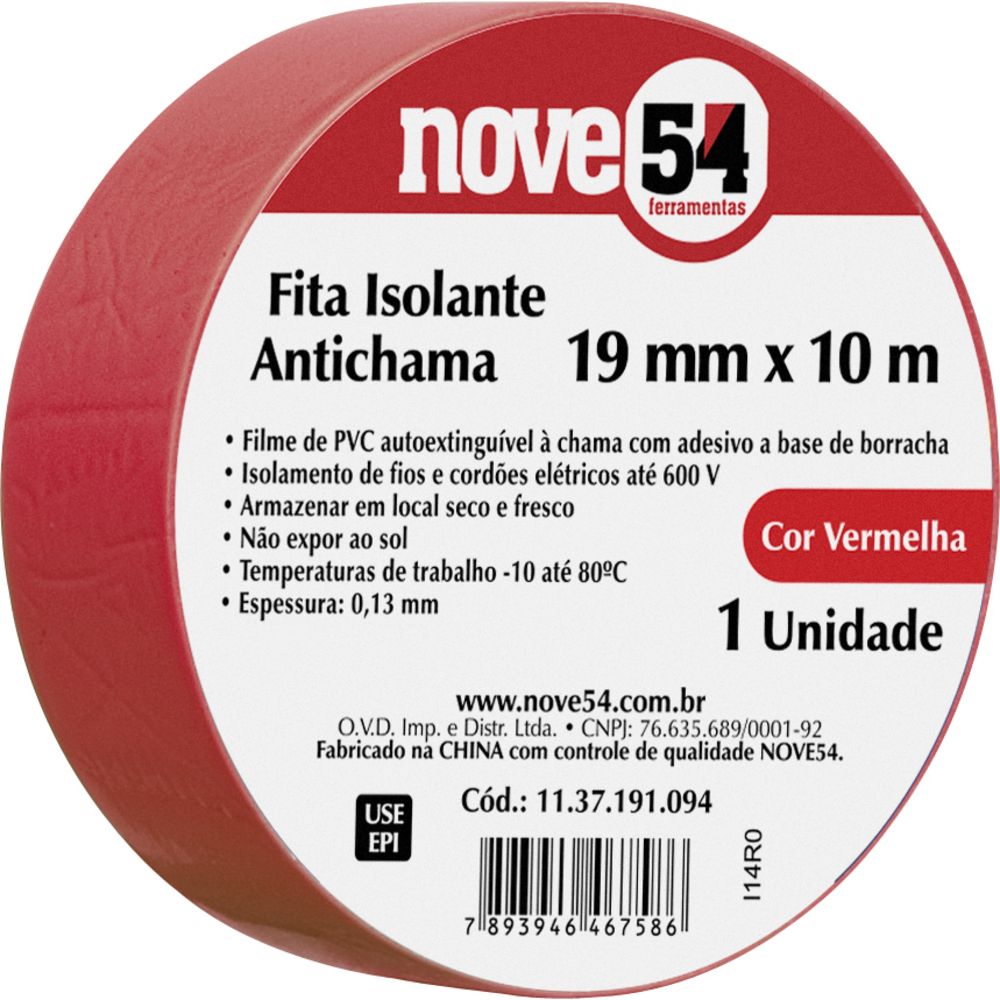 Largura x comprimento da fita isolante: 19 mm x 10 m Material da fita isolante: Filme de PVC com adesivo a base de borracha Cor da fita isolante: Vermelha Espessura da fita isolante: 0,13 mm Tensão máxima de isolamento da fita isolante: 600 V