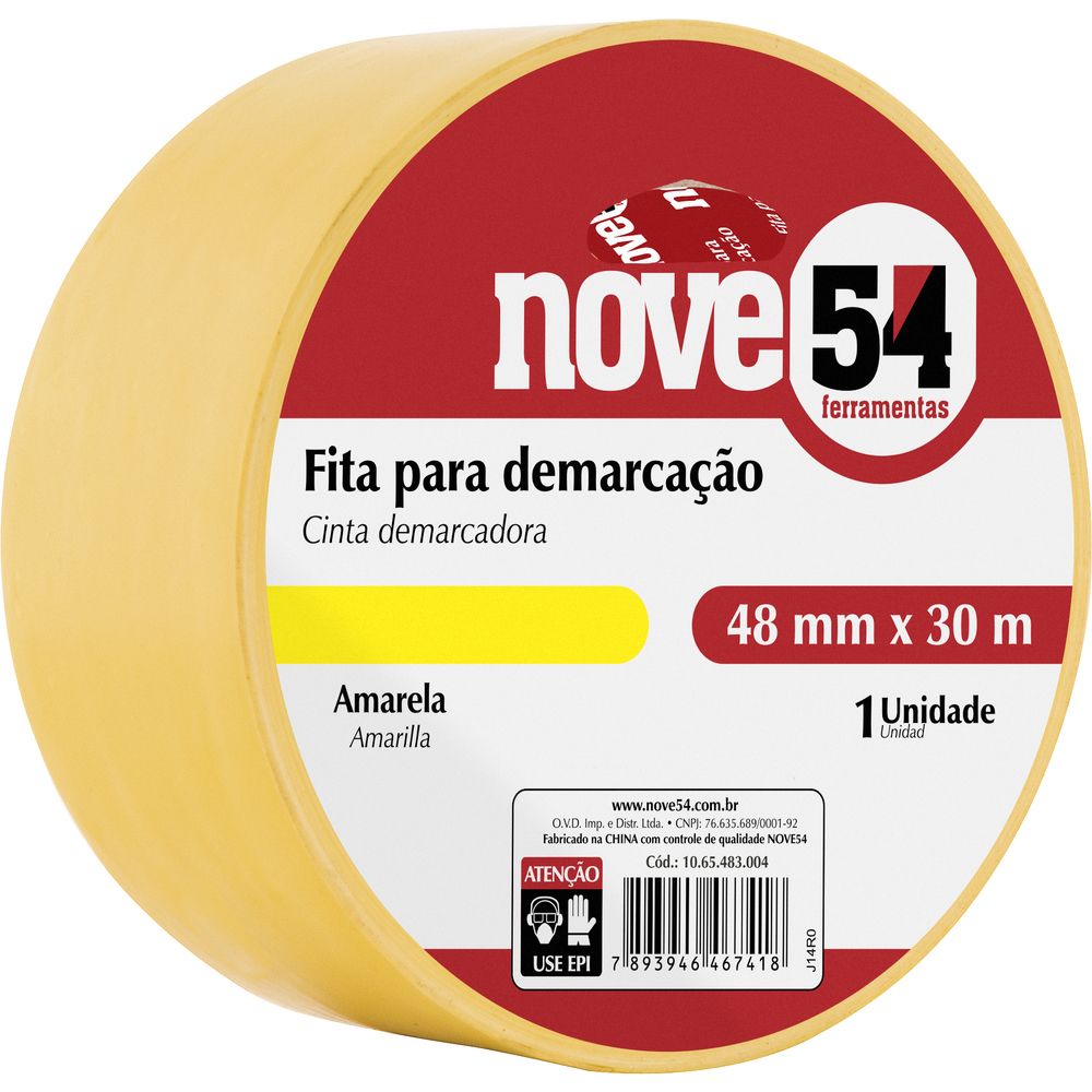 Largura x comprimento da fita para demarcação: 48 mm x 30 m Material da fita para demarcação: Costado macio de PVC com polímero plástico,revestido com uma camada resistente de borracha adesiva Cor da fita para demarcação: Amarela Espessura da fita para demarcação: 0,13 mm
