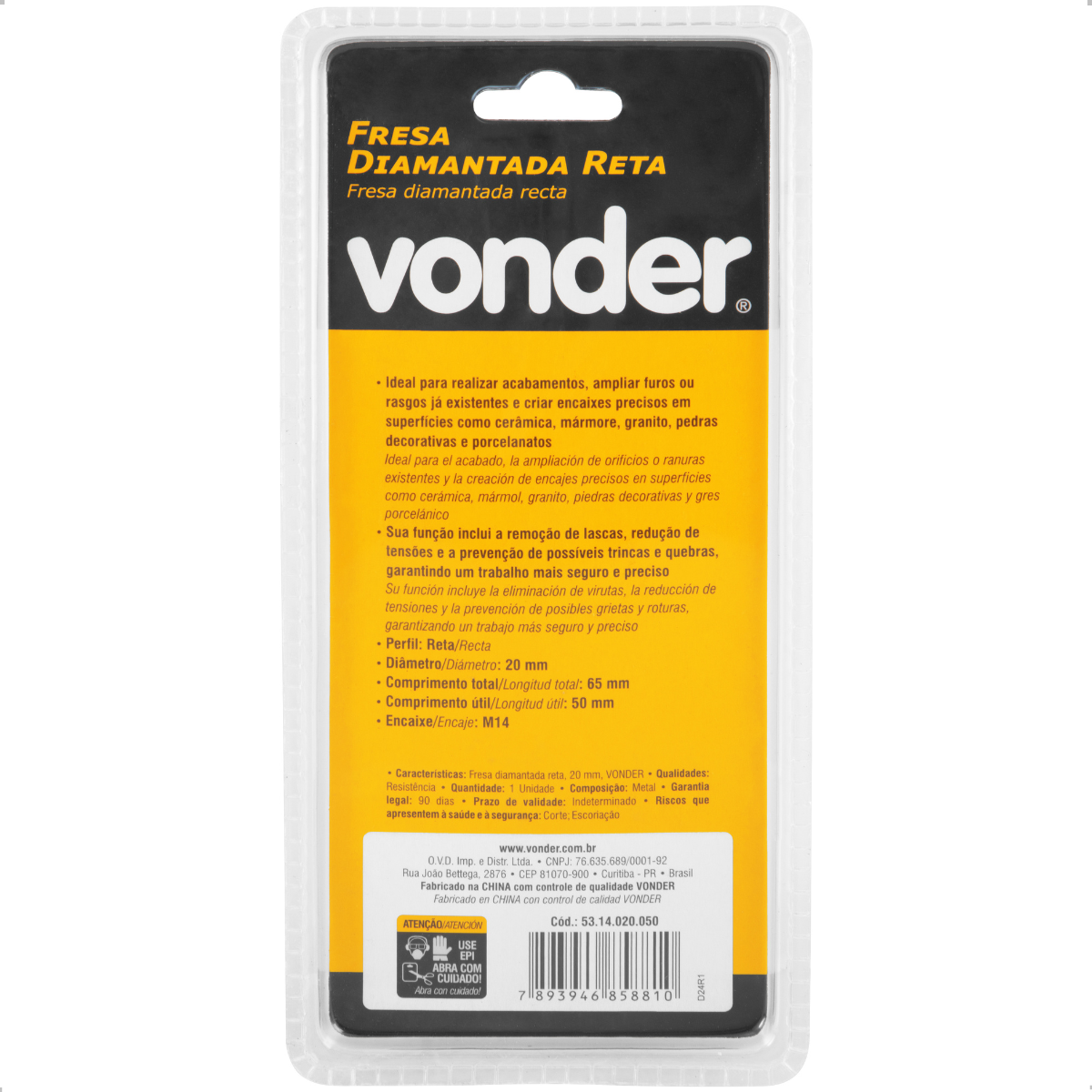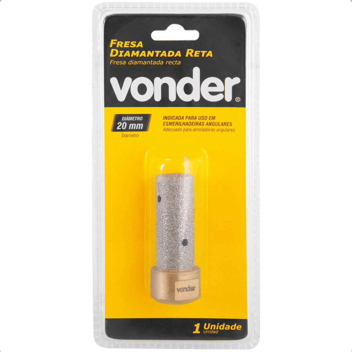 Com um diâmetro de 20 mm, comprimento total de 65 mm e comprimento útil de 50 mm, a fresa diamantada Vonder é perfeita para ampliar furos, criar encaixes precisos e realizar acabamentos detalhados. Sua estrutura reta permite um controle superior, tornando os cortes mais uniformes e eficientes.