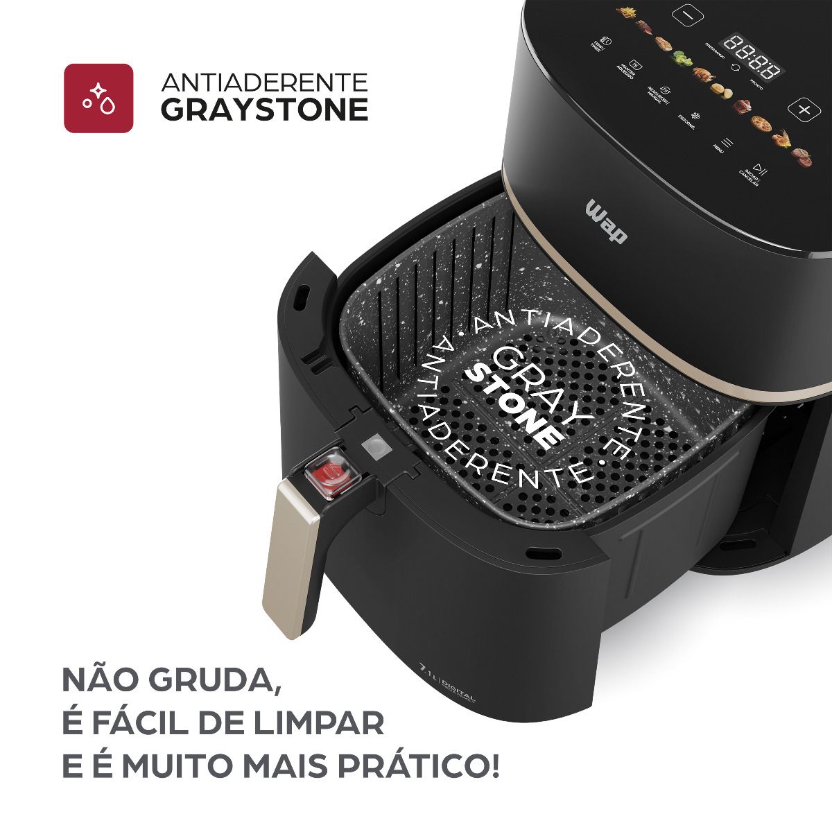O duplo antiaderente GrayStone aumenta a durabilidade do cesto, e garante que os alimentos não grudem.