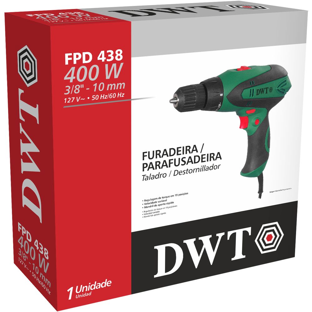 Compacta e prática de usar. Possui regulagem de torque em 19 posições, adequando-se à necessidade de aperto de acordo com a dureza do material. Velocidade variável (2 velocidades). Cabo com revestimento emborrachado para maior conforto do operador, além de dupla isolação, garantindo maior segurança. Possui, ainda, mandril de aperto rápido proporcionando a troca rápida do acessório utilizado.