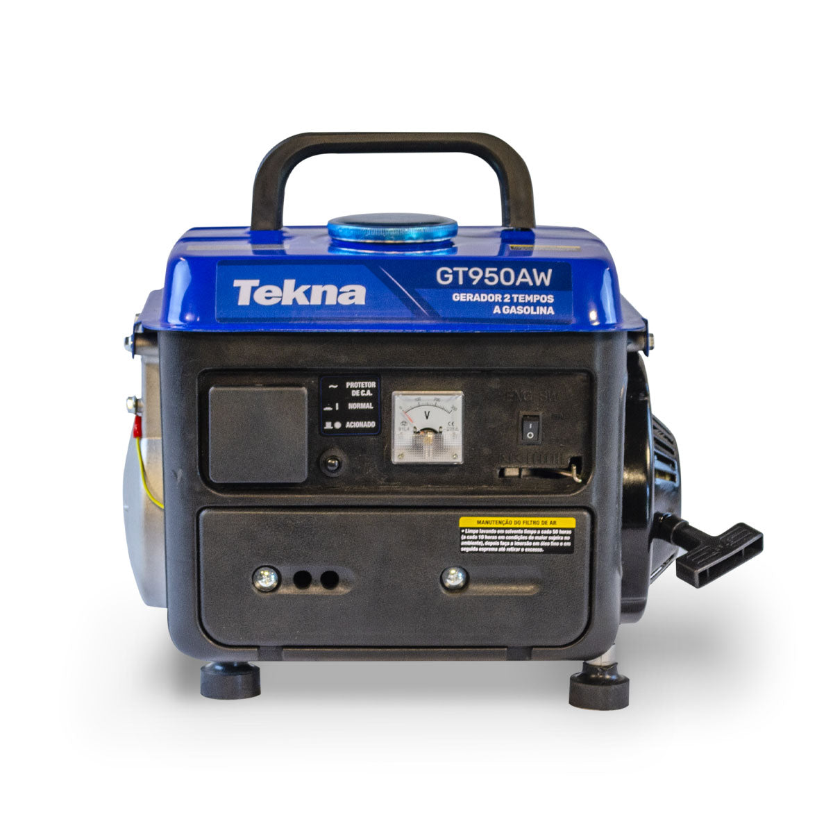 O Gerador a Gasolina Tekna GT950AW é equipado com alça que facilita o transporte, altamente prático e leve. Conta com pés de borracha que reduzem a vibração e ruído.