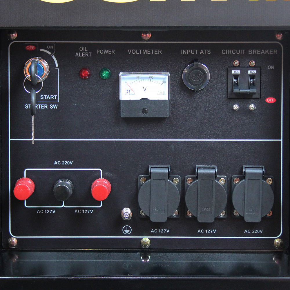 Bivolt 127/220V: O gerador é bivolt, permitindo a alternância entre 127V e 220V de acordo com a demanda, tornando-o versátil para diferentes tipos de aparelhos e aplicações.
