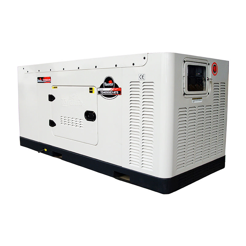 Grupo Gerador Toyama, Equipado com motor 4 cilindros de 52,3CV, partida elétrica, Trifásico, Potência Máxima de 41KVA e Potência Nominal de 37,0 KVA, Trifásico 220V, equipado com tanque de 50 litros, baixo nível de ruído somente 70dB a 7 metros de distância.