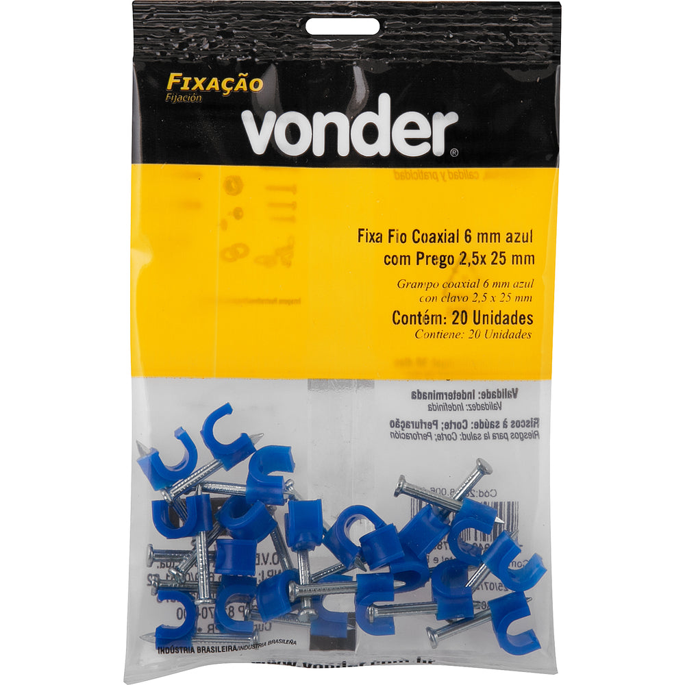 Grampo Fixa-Fio Coaxial 6 c/ Prego 2,5x25 Azul 20 pçs Vonder