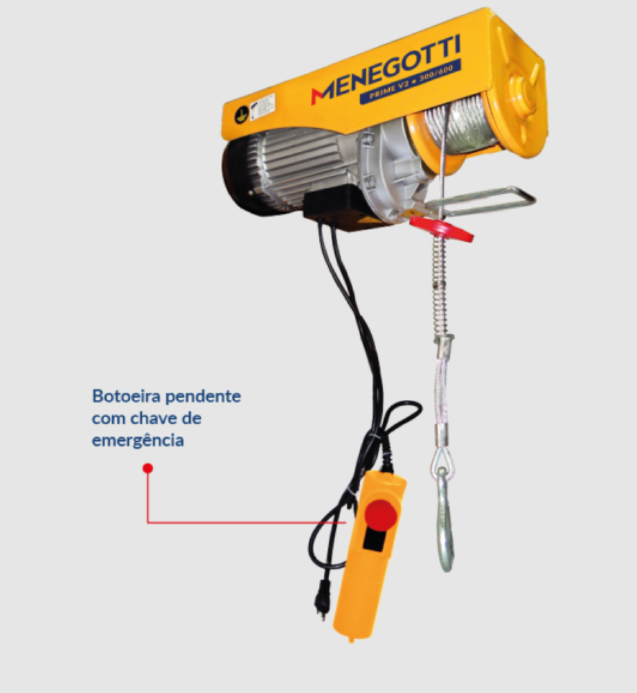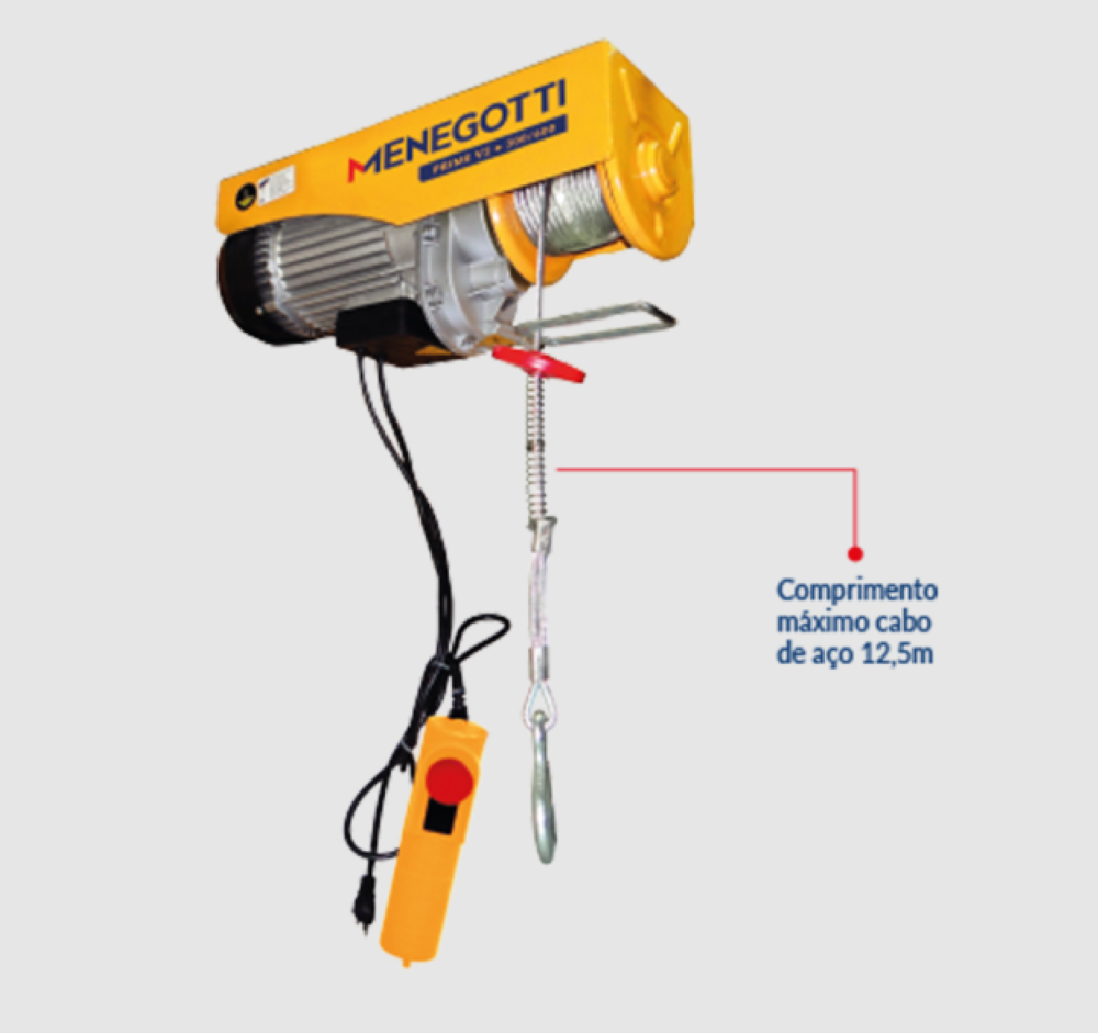 Com cabo de aço galvanizado e não rotativo de 1ª qualidade (18×7 AF), esse equipamento foi desenvolvido para trabalhos de elevação de cargas, capaz de reduzir esforço físico, aumentar a produtividade e eficiência do operador. Possui redutor com carcaça de alumínio, proteção (estrutura) em chapa de aço reforçado, botoeira pendente com chave de emergência e fim de curso para desligamento automático. O freio é acionado por mola de compressão e desativado por força centrífuga.
