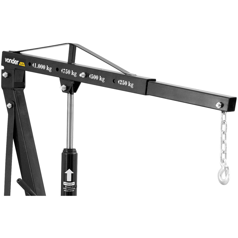 Capacidade de carga máxima do guincho hidráulico: 1000 kg - 1,0 t Capacidade de carga do guincho hidráulico estágio 2: 750 kg - 0,75 t Capacidade de carga do guincho hidráulico estágio 3: 500 kg - 0,5 t Capacidade de carga do guincho hidráulico estágio 4: 250 kg - 0, 25 t Elevação mínima com prolongador estendido do guincho hidráulico (A): 130,0 mm Elevação mínima sem prolongador do guincho hidráulico (B): 600,0 mm Elevação a 90° com prolongador estendido do guincho hidráulico (C): 1400,0 mm Elevação máxima com prolongador estendido do guincho hidráulico (E): 2015,0 mm Comprimento total do guincho hidráulico (F): 1620,0 mm Altura total da torre do guincho hidráulico (H): 1580,0 mm Distância externa entre rodas na extremidade mais larga do guincho hidráulico(L): 925,0 mm Distância interna entre rodas na extremidade mais larga do guincho hidráulico(J): 795,0 mm Medida externa do chassis abaixo da torre do guincho hidráulico(I): 610,0 mm Espessura da chapa do pé do guincho hidráulico (M): 3,20 mm Espessura da chapa do braço do guincho hidráulico (N): 3,20 mm Espessura da chapa da torre do guincho hidráulico (O): 3,20 mm Dimensões do Guincho dobrado (C x L x A): 830 mm x 615 mm x 1480 mm