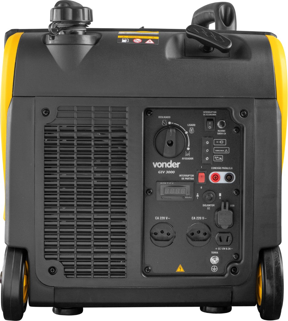 Gerador de tecnologia do tipo inversor, que proporciona menor ruído e menor consumo de combustível, sendo mais leve e eficiente se comparado aos geradores tradicionais. Possui controle microprocessado que assegura geração de energia limpa e estável com protetor contra sobrecarga. Conta com visor que informa a tensão, frequência e tempo de horas trabalhadas. Possui ainda sistema de partida elétrica e manual retrátil, luzes indicativas de falta de óleo, sobrecarga e ligado. Com um sistema integrado, é possível realizar ligação paralela com outro gerador GIV 3000, multiplicando sua potência nominal pela quantidade de geradores interligados.