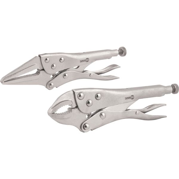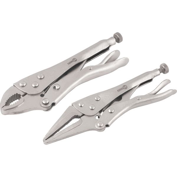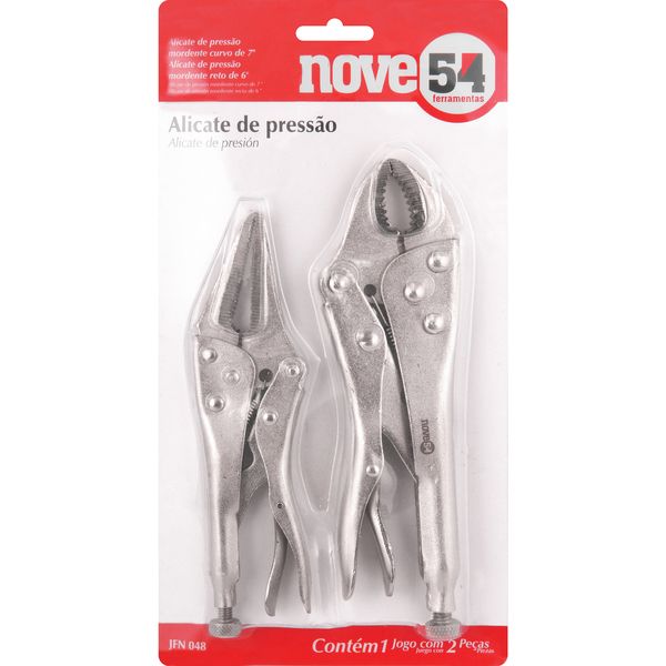 Conteúdo Embalagem:1 Jogo de alicates de pressão, composto por 2 peças, sendo: 1 alicate de pressão mordente curvo de 7" e 1 alicate de pressão mordente reto de 6"