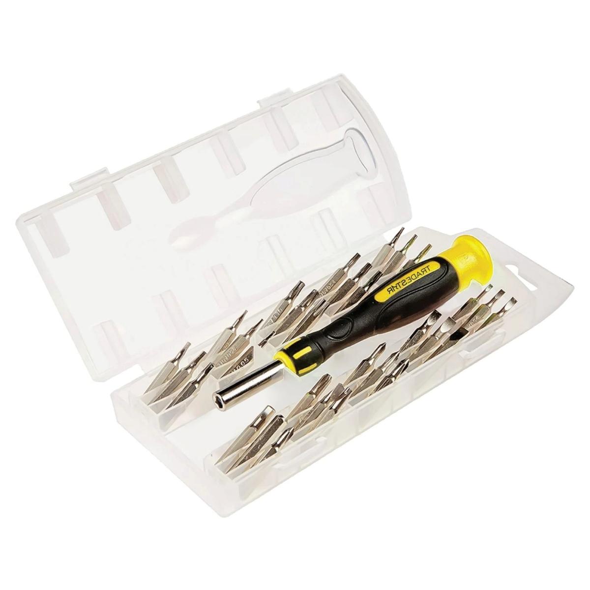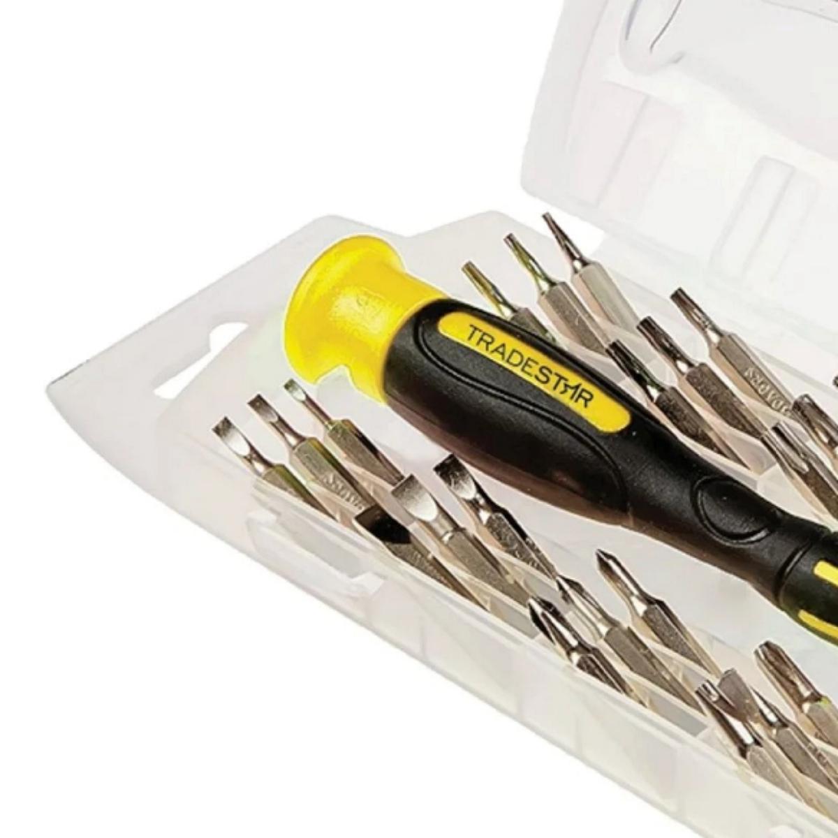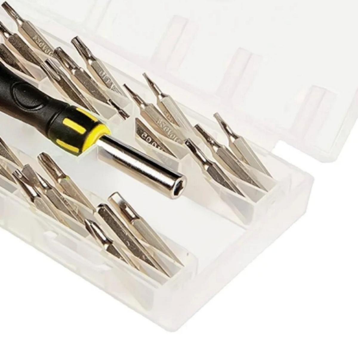 Com 31 peças intercambiáveis, o conjunto traz uma ampla variedade de pontas, atendendo múltiplas necessidades em reparos de celulares, notebooks, óculos, eletrodomésticos, consoles de videogame, placas eletrônicas, pequenos equipamentos e muito mais.