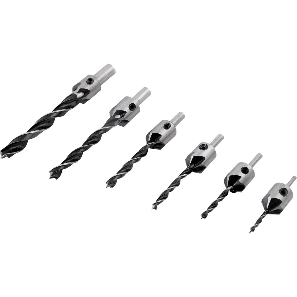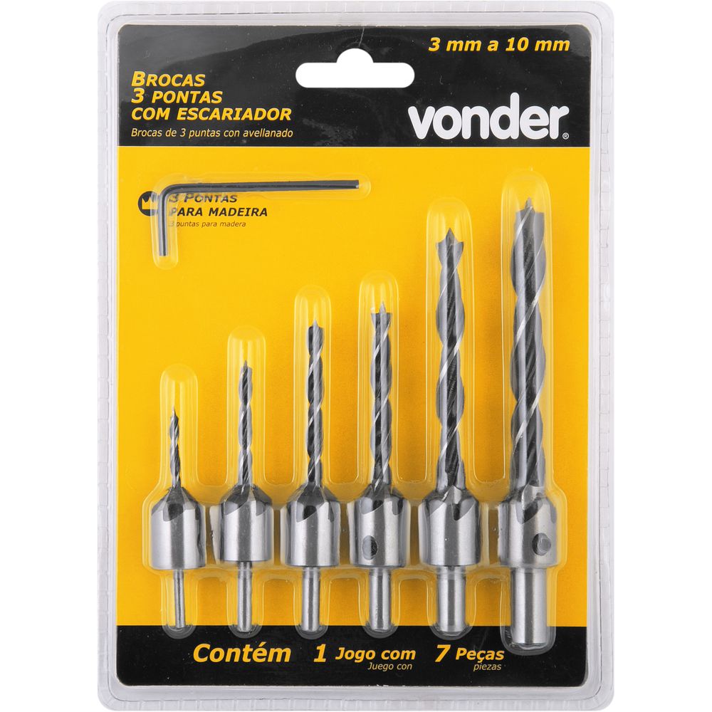 6 Brocas com escariadores, sendo: broca: 3 mm x 60 mm com escariador de 16 mm | broca: 4 mm x 73 mm com escariador de 16 mm | broca: 5 mm x 83 mm com escariador de 16 mm | broca: 6 mm x 89 mm com escariador de 16 mm | broca: 8 mm x 110 mm com escariador de 16 mm e broca: 10 mm x 120 mm com escariador de 19 mm e 1 unidade chave allen 2,5 mm.