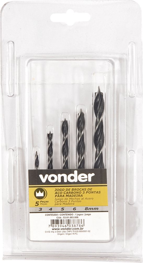 Jogo Broca 3 Pontas Aço Carbono 3 À 8mm Madeira 5 P Vonder