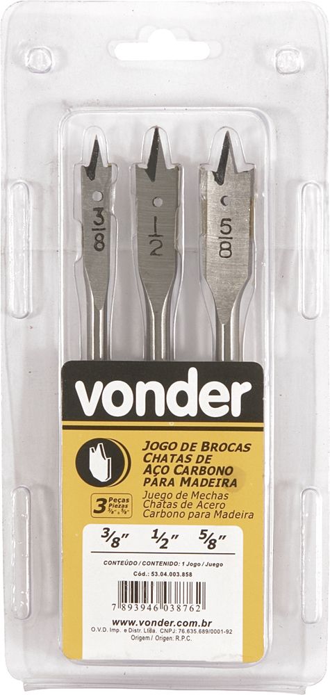 Conteúdo da embalagem 1 Jogo de brocas chatas com 3 peças, sendo: 3/8" - 1/2" e 5/8" Aplicações e dicas de uso Indicado para chapas finas de madeira e derivados Destaques e diferenciais Possui ponta com afiações especiais, que facilitam a centralização do furo. Estojo plástico que facilita a acomodação, organização.