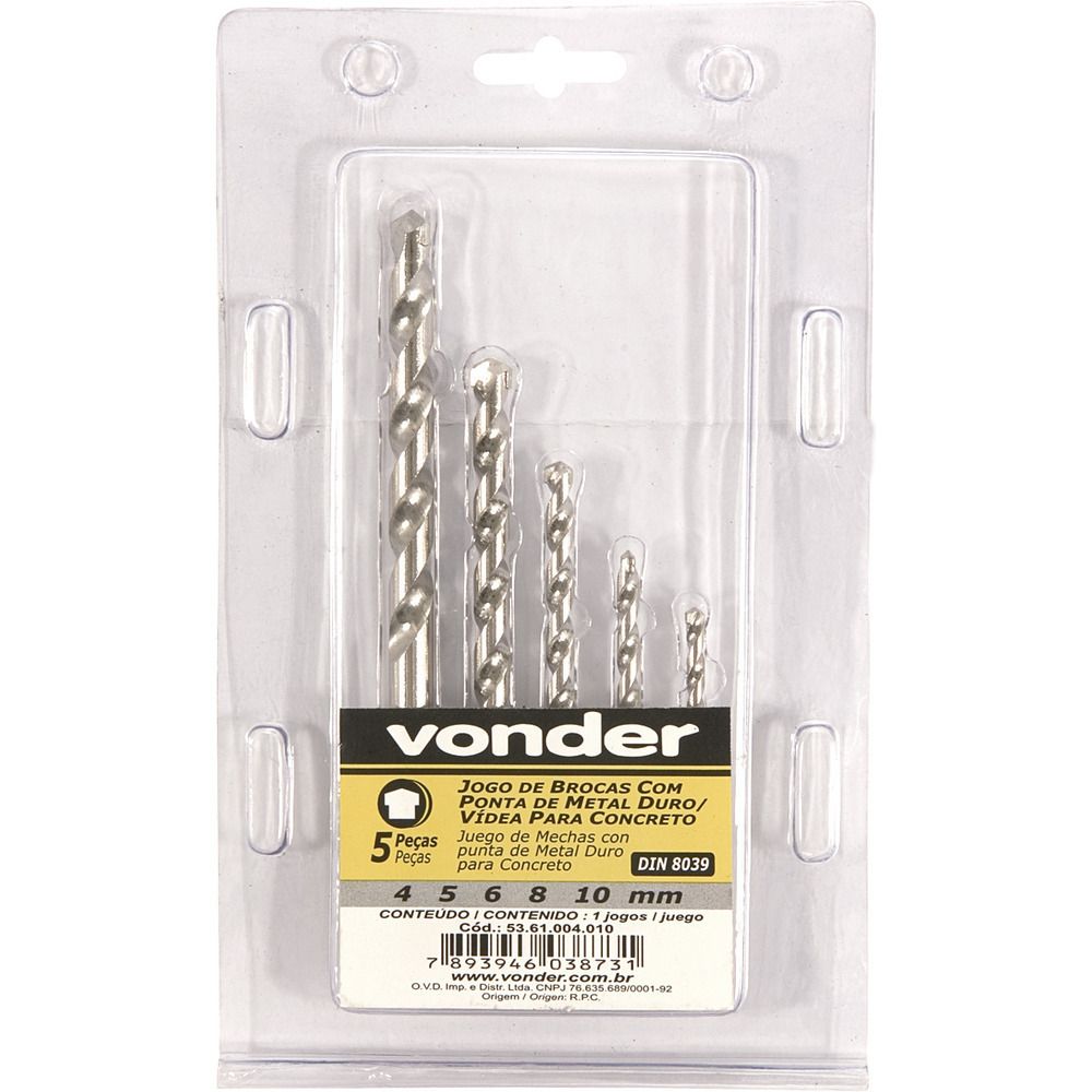Conteúdo da embalagem 1 Jogo de brocas para concreto com 5 peças, sendo: 4 mm, 5 mm, 6 mm, 8 mm e 10 mm Aplicações e dicas de uso Indicado para concreto e alvenaria Destaques e diferenciais Possui ponta de metal duro/vídea, proporcionando maior durabilidade. Conta com acabamento niquelado que confere maior resistência contra oxidação/corrosão, além de cartela plástica que facilita a acomodação/organização das brocas.