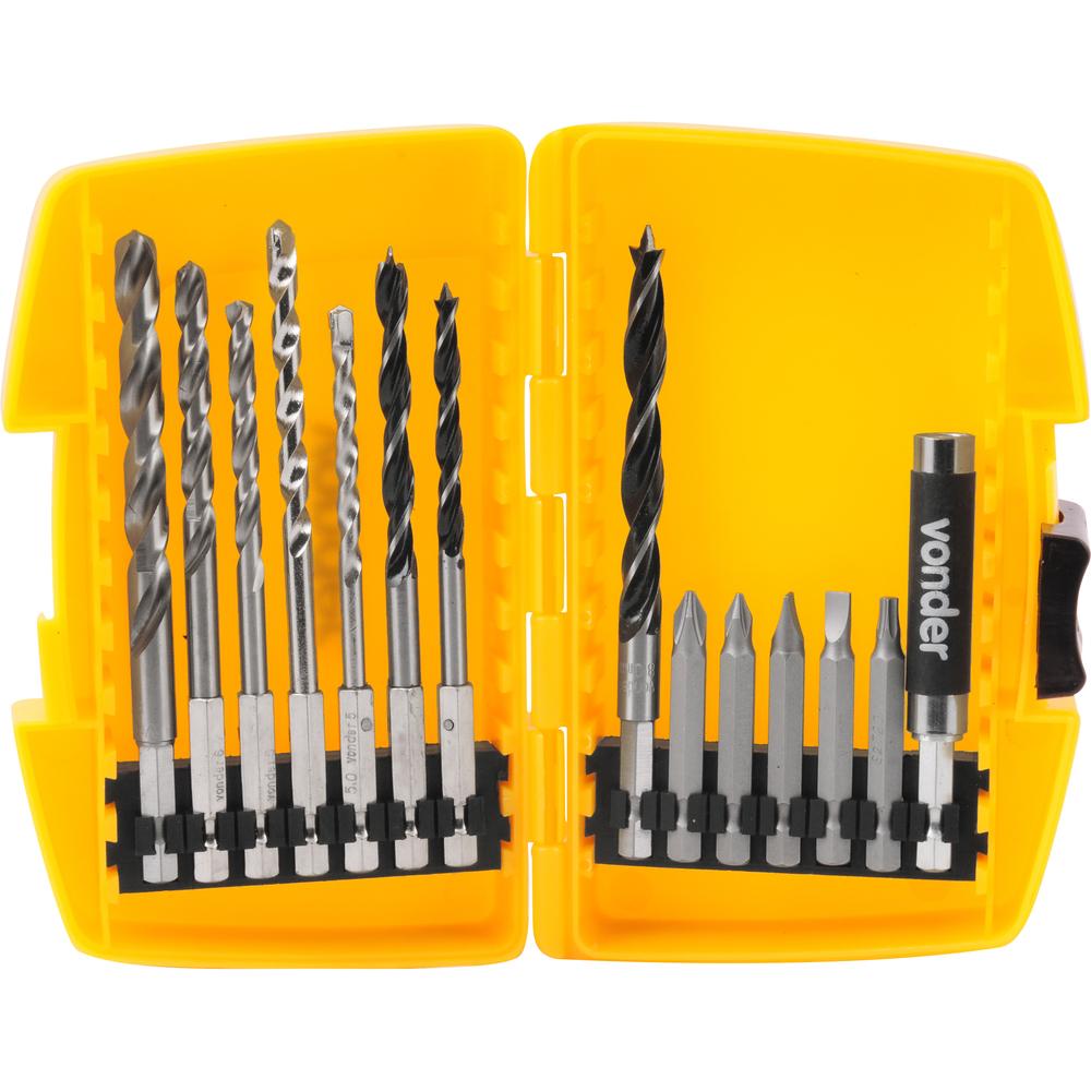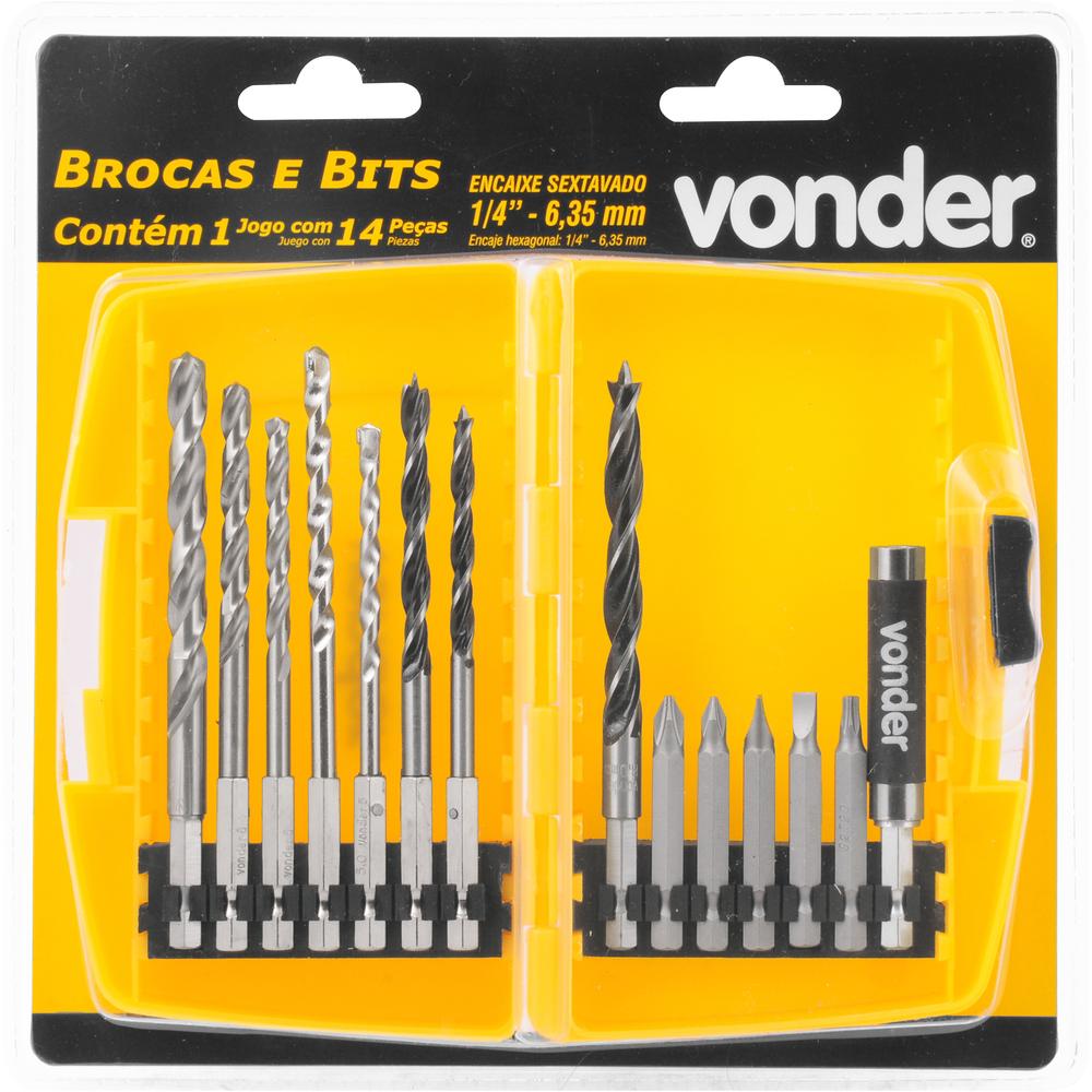 1 Jogo de bits/ponteiras e brocas, composto por 1 estojo com 14 peças, sendo: 3 brocas com encaixe sextavado 1/4" de 3 pontas para madeira (5 mm, 6 mm e 8 mm), 2 brocas com encaixe sextavado de 1/4" com ponta de metal duro (5 mm e 6 mm), 3 brocas com encaixe sextavado de 1/4" de aço rápido (5 mm, 6 mm e 8 mm), 2 bits fenda S2 comprimento 50 mm (5 mm e 6 mm), 2 bits phillips S2 comprimento 50 mm (PH1 e PH2), 1 bits hexalobular S2 50 mm (T20) e 1 adaptador extensível para bits.