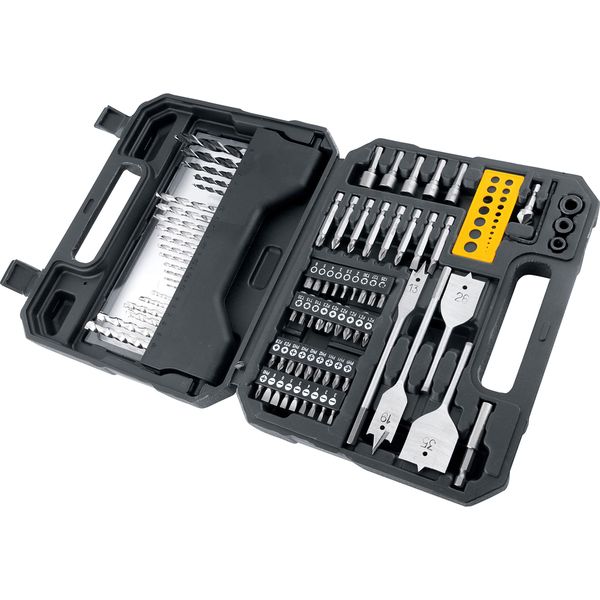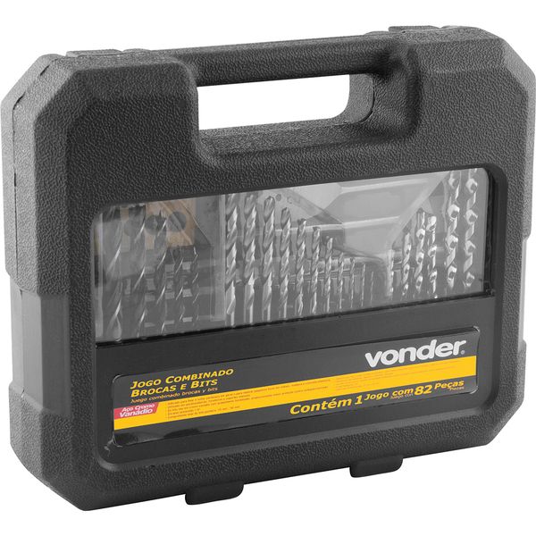 1 Jogo de bits/ponteiras e brocas, composto por 1 maleta plástica com 82 peças, sendo: 1 adaptador magnético 60 mm, 2 bits fenda 50 mm (5 mm e 6 mm), 3 bits phillips 50 mm (PH1, PH2, PH3), 3 bits pozidrive 50 mm (PZ1, PZ2, PZ3), 8 bits phillips 25 mm (2 - PH0, 2 - PH1, 2 - PH2 e 2 - PH3), 8 bits fenda 25 mm (2 de 3 mm, 2 de 4 mm, 2 de 5 mm e 2 de 6 mm), 8 bits pozidrive 25 mm (2 - PZ0, 2 - PZ1, 2 - PZ2 e 2 - PZ3), 6 bits hexalobular 25 mm (T10, T15, T20, T25, T27 e T30), 6 bits allen 25 mm (2 de 2,5 mm, 1 de 3 mm, 1 de 4 mm, 1 de 5 mm e 1 de 6 mm), 5 soquetes sextavados (6 mm, 7 mm, 8 mm, 9 mm e 10 mm), 1 chave allen 2,5 mm, 3 limitadores de profundidade para broca de 5 mm, 6 mm e 8 mm, 1 escariador com 10 mm de diâmetro por 30 mm de comprimento, 1 gabarito para verificação da medida da broca de 1,5 mm a 6,5 mm, 4 brocas chata para madeira (13 mm, 16 mm, 19 mm e 22 mm), 5 brocas com 3 pontas para madeira (4 mm, 5 mm, 6 mm, 8 mm e 10 mm), 11 brocas de aço rápido (1,5 mm, 2 mm, 2,5 mm, 3 mm, 3,5 mm, 4 mm, 4,5 mm, 5 mm, 5,5 mm, 6 mm e 6,5 mm), 6 brocas de vídea para concreto (4 mm, 5 mm, 6 mm, 7 mm, 8 mm e 9 mm)