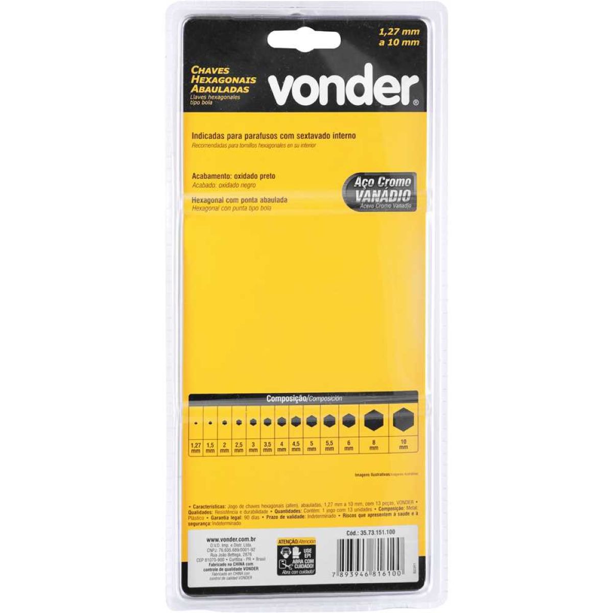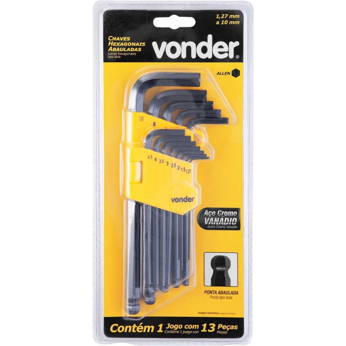 Jogo Chave Allen 1,27-10mm CRV Tipo L Longa Abaulada Com 13 Peças Vonder