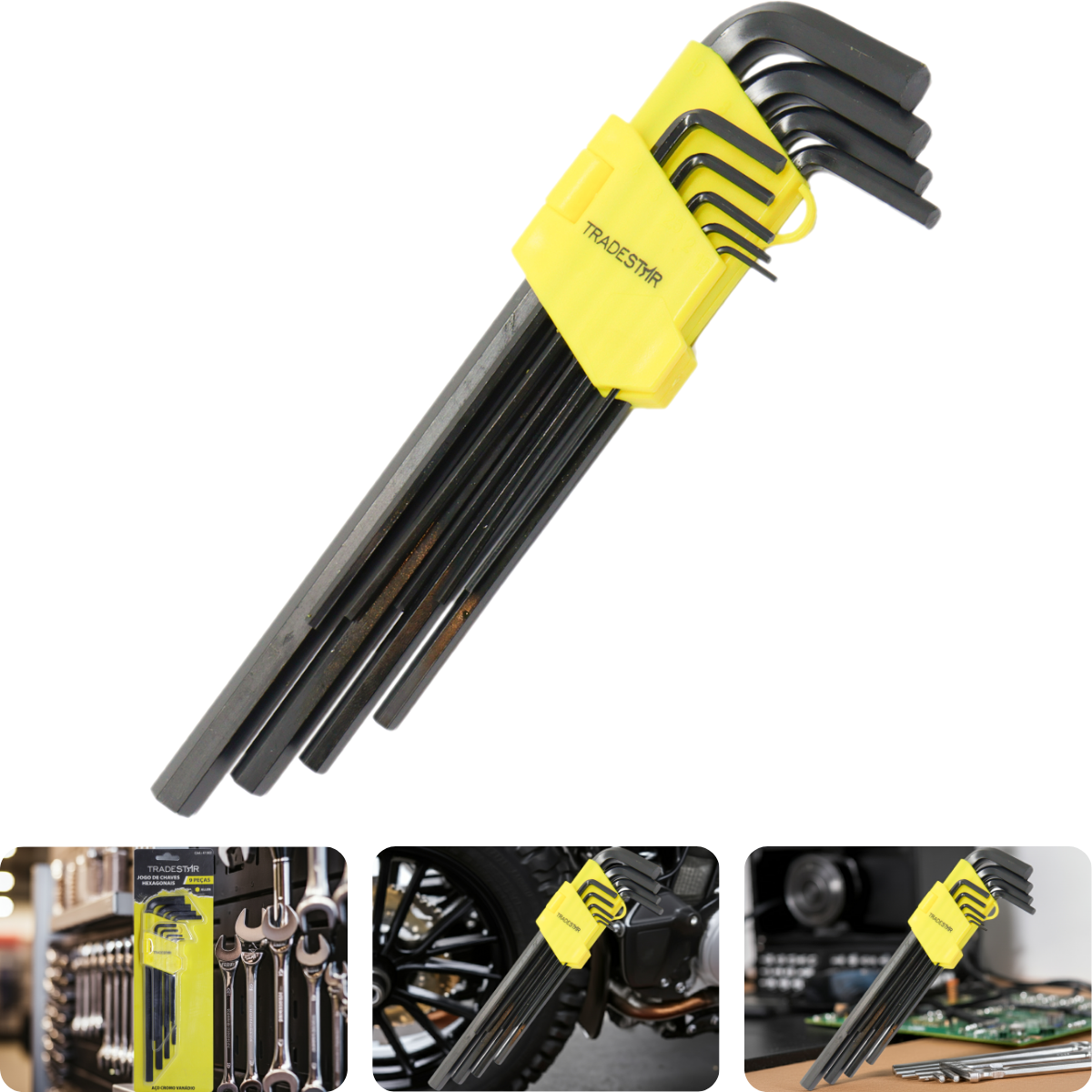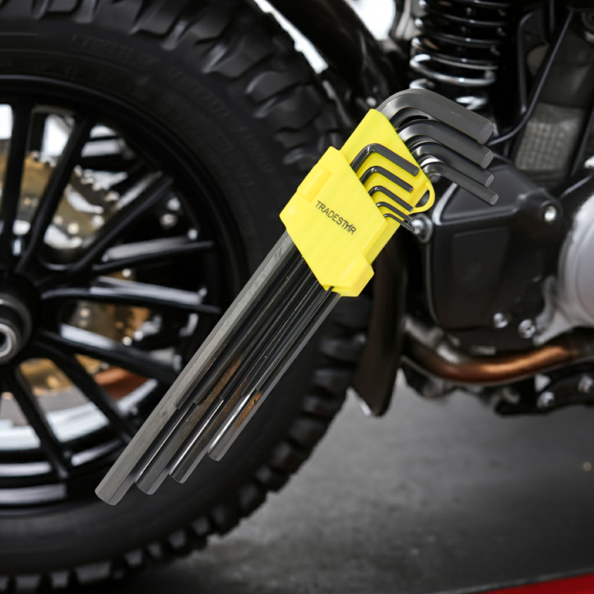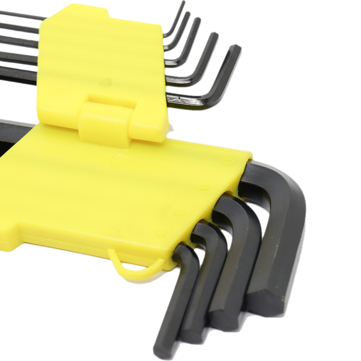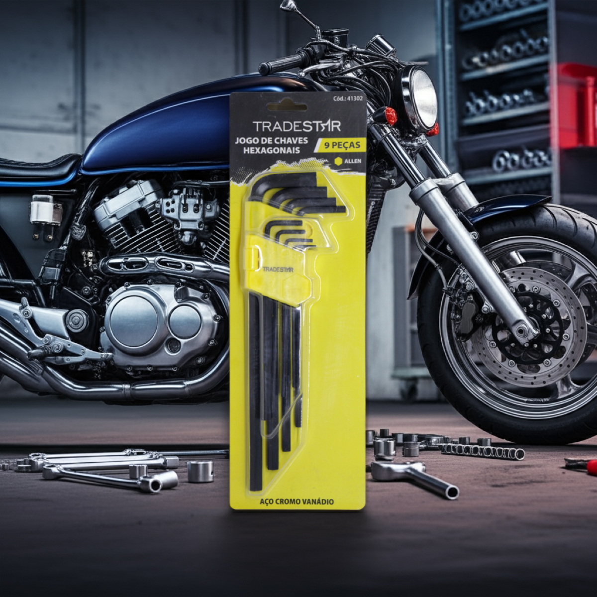 Este conjunto inclui 9 chaves Allen longas nos tamanhos mais utilizados: 1,5 mm, 2 mm, 2,5 mm, 3 mm, 4 mm, 5 mm, 6 mm, 8 mm e 10 mm. Essa variedade cobre uma ampla gama de necessidades em montagem de móveis, bicicletas, motocicletas, equipamentos eletrônicos, reparos automotivos e manutenção industrial.