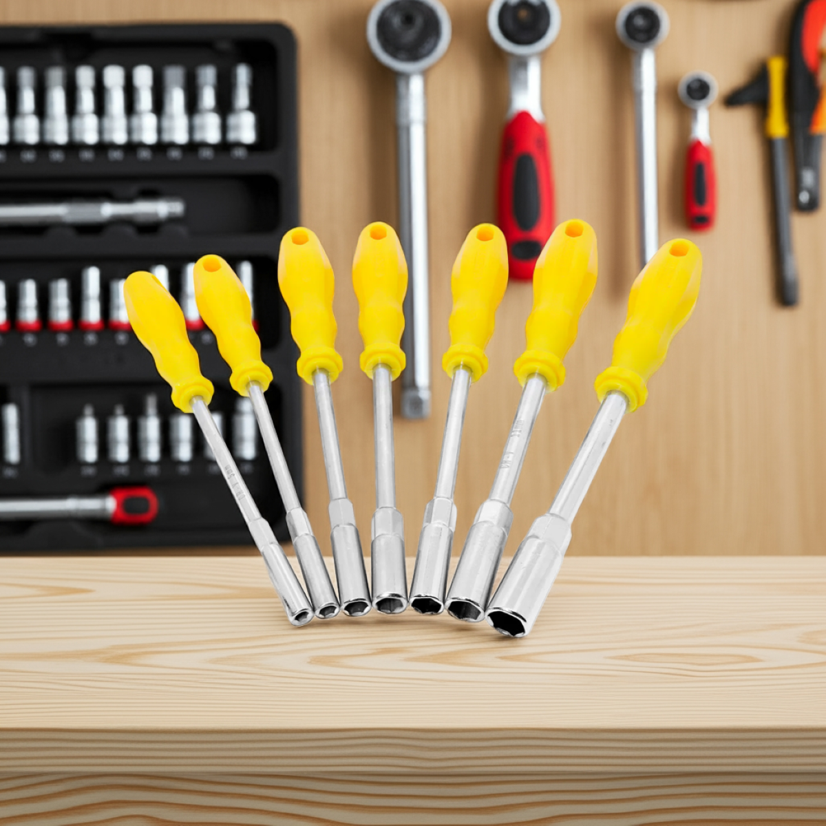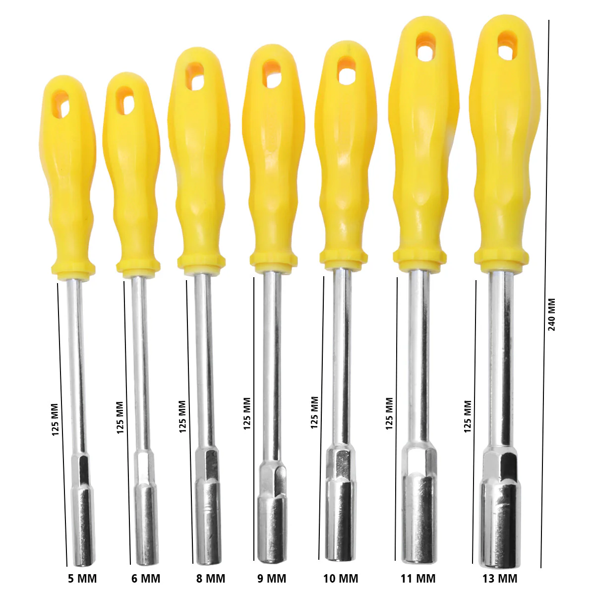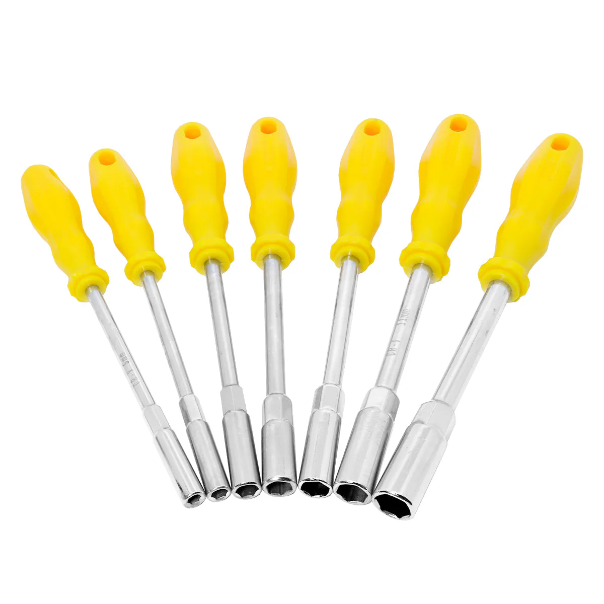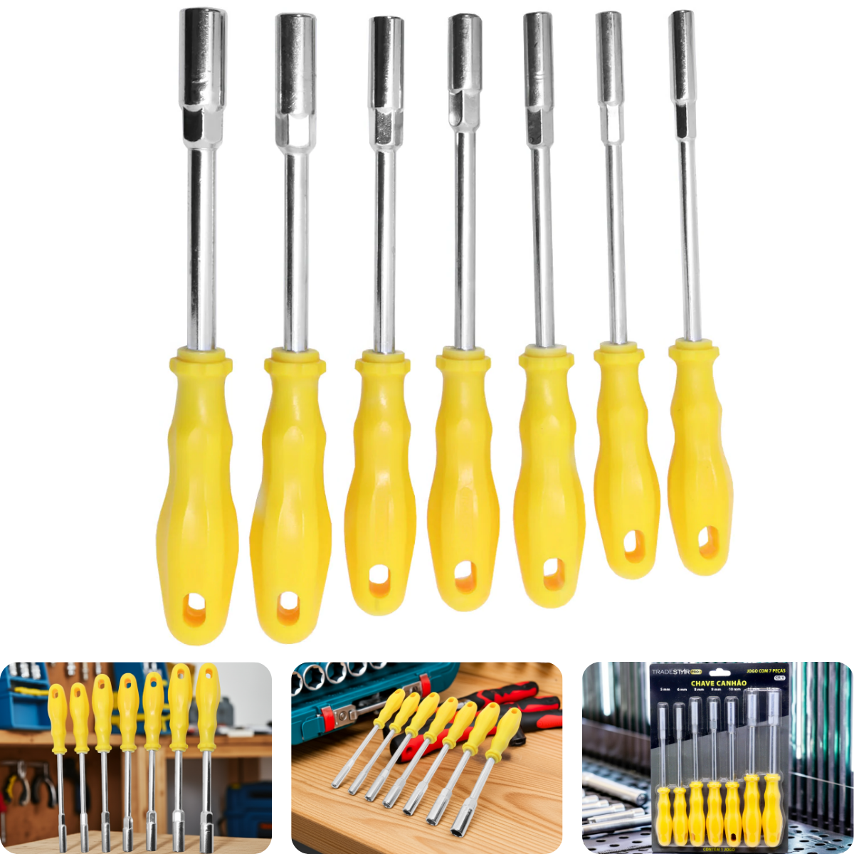 Composto por 7 peças nos tamanhos 5 mm, 6 mm, 7 mm, 8 mm, 9 mm, 10 mm e 13 mm, o kit cobre uma ampla faixa de medidas, oferecendo a solução adequada para diferentes tipos de parafusos sextavados. Essa variedade torna o jogo indispensável para quem busca praticidade e eficiência em seus trabalhos do dia a dia.