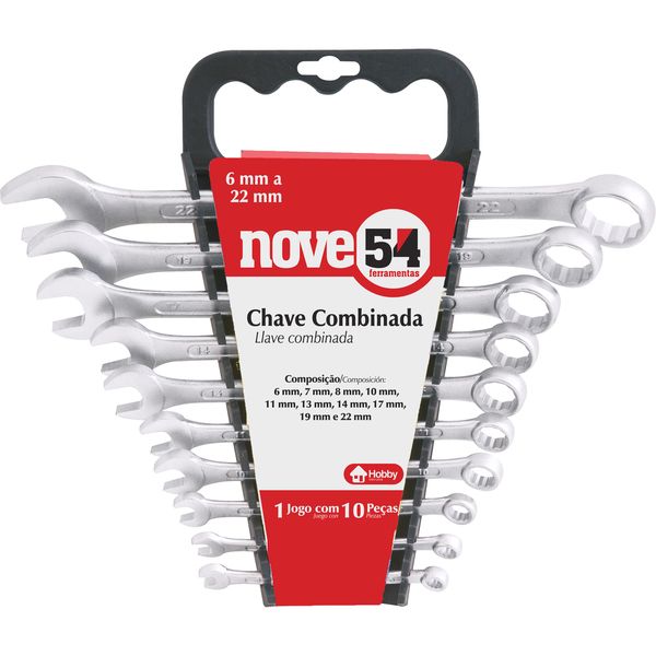 Conteúdo da embalagem 1 Jogo de chaves combinadas, composto por um suporte plástico com 10 peças, sendo: 6 mm, 7 mm, 8 mm, 10 mm, 11 mm, 13 mm, 14 mm, 17 mm, 19 mm e 22 mm Aplicações e dicas de uso Indicado para apertar e soltar porcas e parafusos sextavados. Nunca utilizar prolongadores sobre as chaves, pois isso aumentará o torque aplicado e diminuirá a vida útil das ferramentas. Uso leve. Destaques e diferenciais Possui acabamento cromado fosco, proporcionando maior resistência contra oxidação/corrosão. Combina na mesma chave um lado fixa e outro estrela, possibilitando aplicações em locais de difícil acesso.