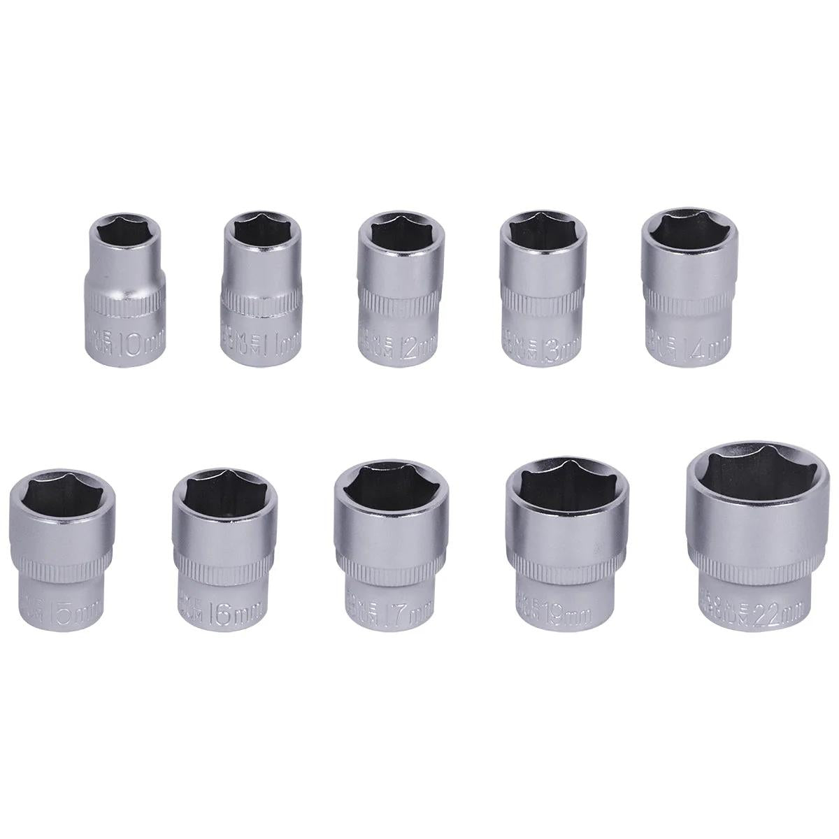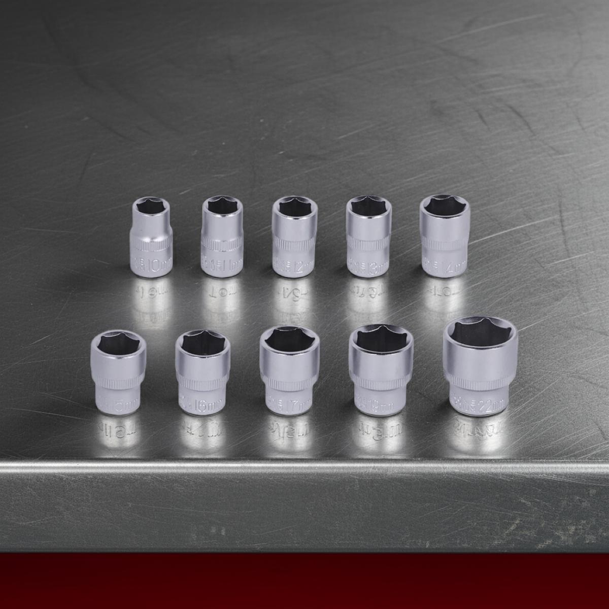 - Tamanhos de soquete: 10 mm, 11 mm, 12 mm, 13 mm, 14 mm, 15 mm, 16 mm, 17 mm, 19 mm e 22 mm