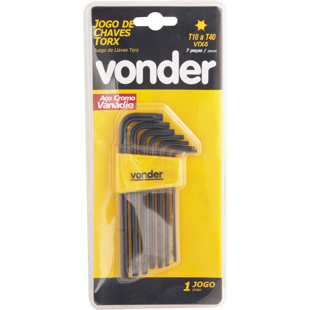 1 Jogo de chaves hexalobular, composto por um suporte plástico com 7 peças, sendo: T10 - T15 - T20 - T25 - T27 - T30 e T40
