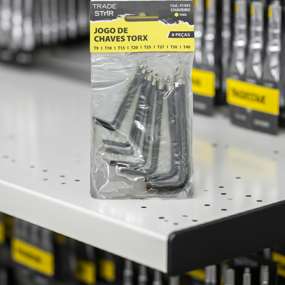 O kit acompanha 8 chaves nos tamanhos T9, T10, T15, T20, T25, T27, T30 e T40, cobrindo as principais medidas utilizadas em diferentes setores. Essa variedade de tamanhos torna o conjunto indispensável tanto para uso profissional quanto doméstico.