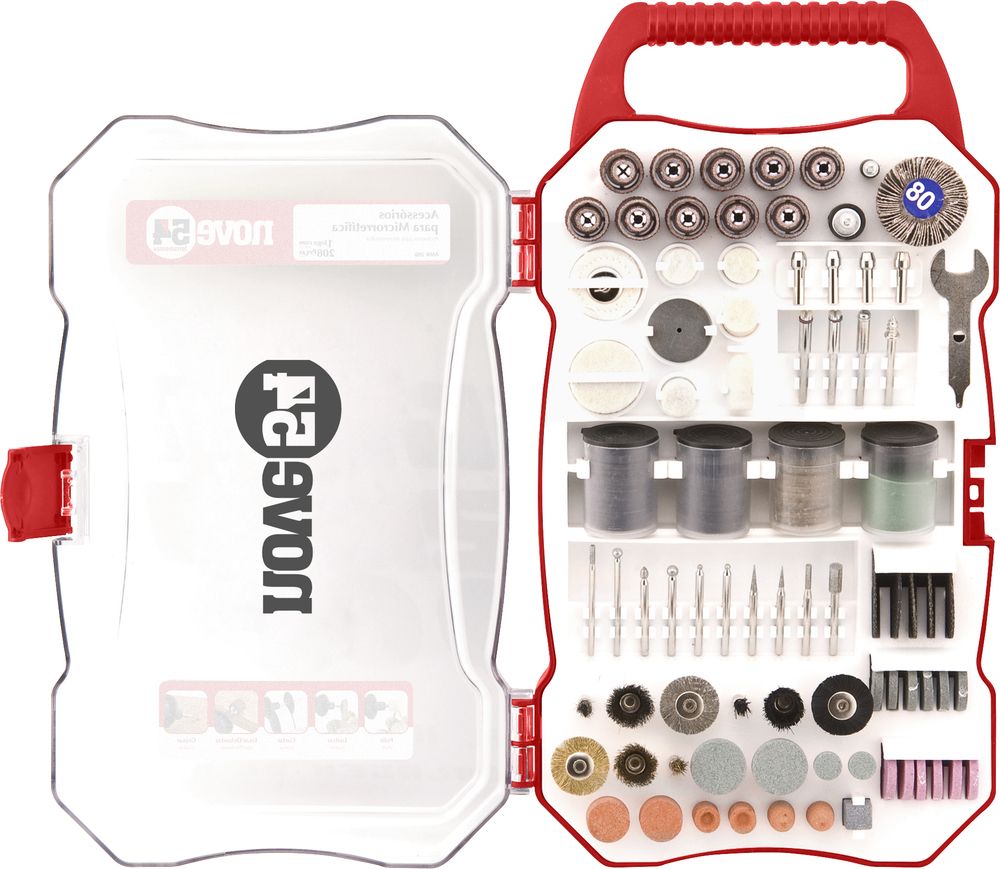 Conteúdo da embalagem 1 Jogo de acessórios para microrretífica, composto por um estojo plástico com 208 peças, sendo: 1 bastão abrasivo, 1 chave para microrretífica, 4 cilindros de feltro, 81 discos de corte, 44 discos de lixa, 1 escova circular de latão com haste, 3 escovas pincéis de inox com haste, 2 escovas pincéis de latão com haste, 3 escovas pincéis de nylon com haste, 2 hastes para lixa cilindro, 2 hastes para disco de corte, 1 haste para disco de feltro, 1 haste para roda de pano, 6 limas rotativas, 4 limas rotativas diamantadas, 20 lixas cilindro, 1 pasta para polimento, 4 pinças para microrretífica, 1 ponta com feltro, 10 pontas montadas, 6 rebolos de carbureto de silício, 6 rebolos de óxido de alumínio, 1 roda de borracha, 1 roda de feltro, 1 roda de lixa e 1 roda de pano Aplicações e dicas de uso Indicado para microrretíficas. Ideal para atividades, como: polir, lustrar, cortar, lixar, desbastar, gravar, entre outros. Destaques e diferenciais Prático, conta com estojo que mantém as peças organizadas, além de possibilitar a realização de diferentes tipos de trabalho