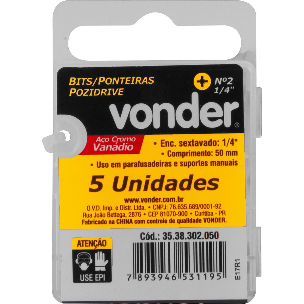 Jogo de Bits Ponteira Pozidrive c/ enc 1/4" Nº 2X50mm Vonder