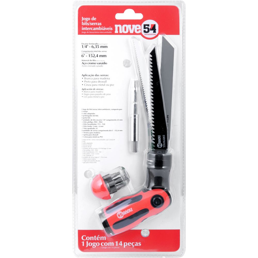 1 Jogo de bits/serras intercambiáveis, composto por: 1 estojo, 1 cabo adaptador, 1 prolongador de bits, 1 porta bits, 7 unidades de bits (2 bits phillips encaixe 1/4" comprimento 25 mm: PH1 - PH2 | 2 bits hexalobular encaixe 1/4" comprimento 25 mm: T15 - T20 | 2 bits fenda encaixe 1/4" comprimento 25 mm: 5 mm - 6 mm | 1 bits quadrado encaixe 1/4" comprimento 25 mm: S1), e 3 unidades de serras comprimento de 6" - 152,4 mm (1 branca, 1 preta e 1 cinza).