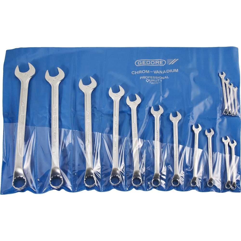 1 Jogo de chaves combinadas, composto por um estojo plástico com 15 peças, sendo: 6 mm, 7 mm, 8 mm, 10 mm, 11 mm, 12 mm, 13 mm, 14 mm, 17 mm, 19 mm, 22 mm, 24 mm, 27 mm, 30 mm e 32 mm.