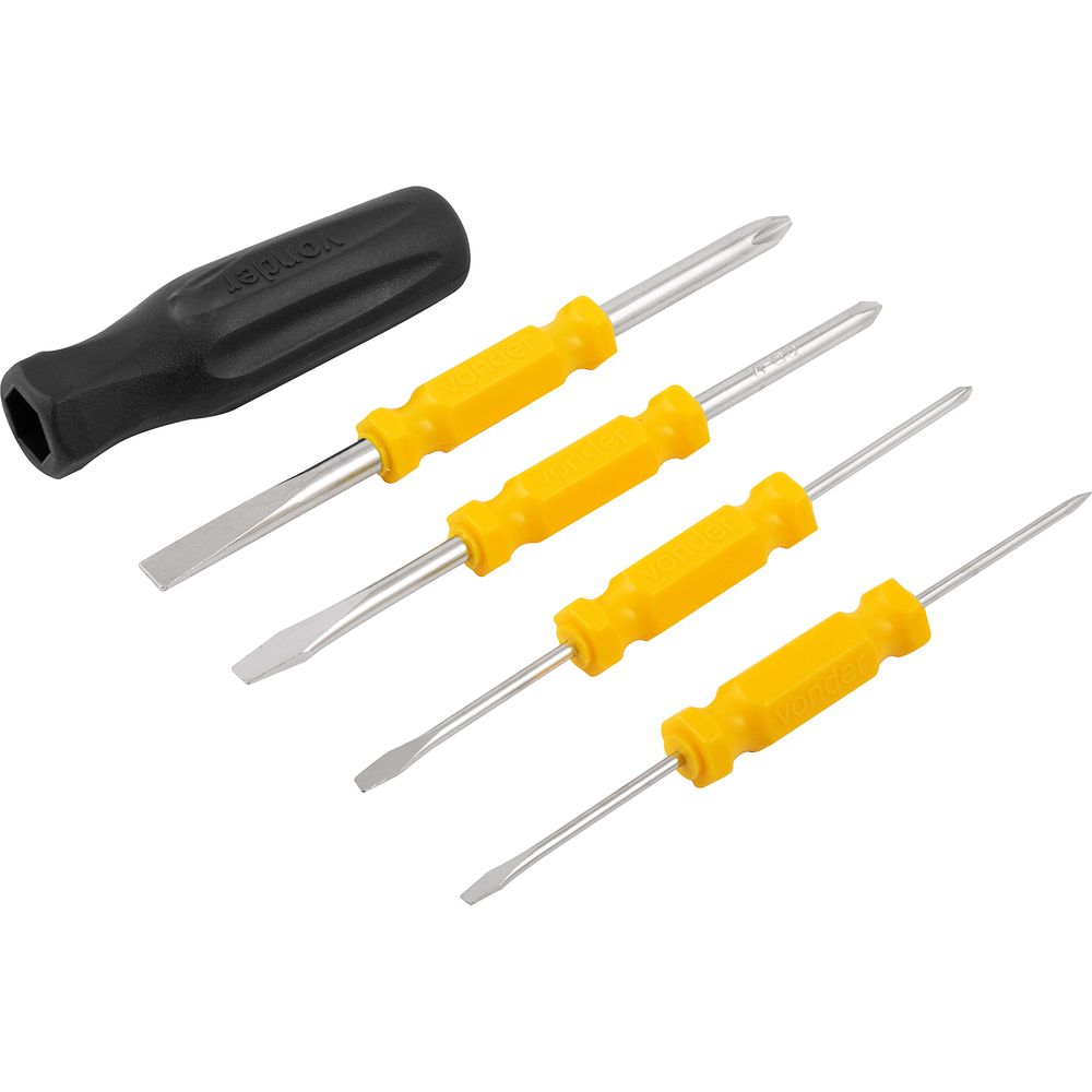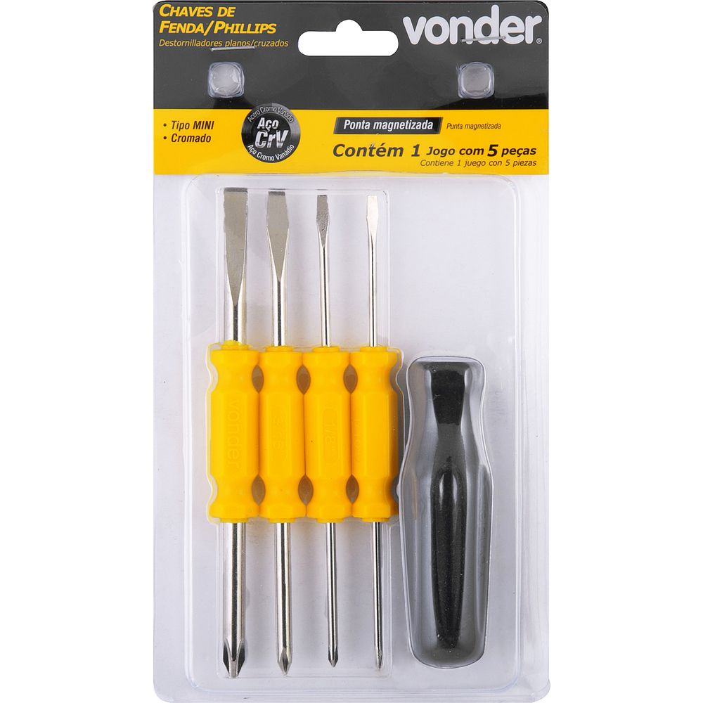 1 Jogo de chaves de fenda/phillips composto por uma cartela com 5 peças, sendo: 1 chave ponta de fenda e furador 1/10" - 2,54 mm (precisão) , 1 chave ponta de fenda e ponta phillips 1/8" - 3,18 mm (N° 0) , 1 chave ponta de fenda e ponta phillips 3/16" - 4,76 mm (N° 1), 1 chave ponta de fenda e ponta phillips 1/4" - 6,35 mm (N° 2) e 1 cabo adaptador
