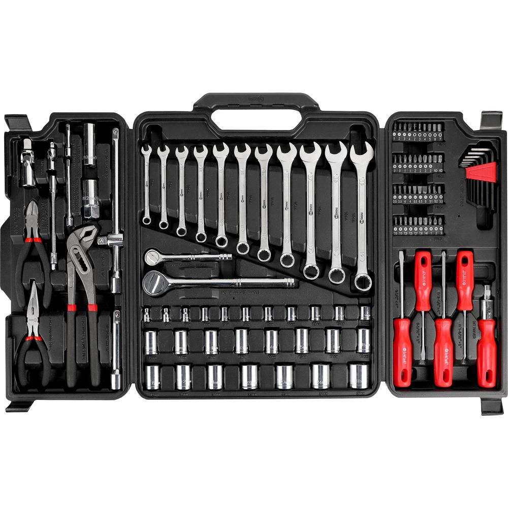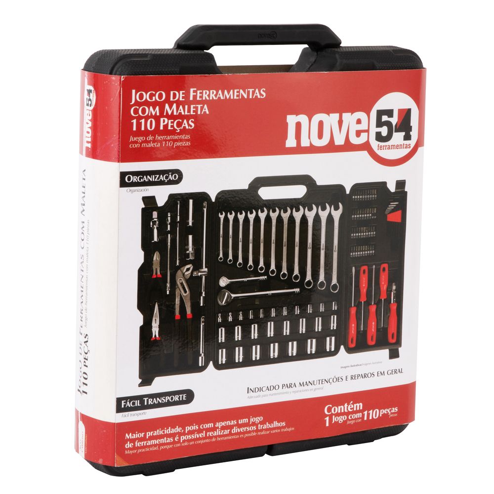1 Jogo de ferramentas, composto por 110 peças, sendo: 1 maleta plástica, 1 porta-chaves allen/hexagonais, 4 porta-bits, 1 alicate corte diagonal 6" em aço carbono, 1 alicate de bico meia-cana 6" em aço carbono, 1 alicate bomba d'água 10" em aço carbono, 2 chaves de fenda em aço carbono (5,0 mm x 75 mm (3/16" x 3") e 6,3 mm x 100 mm (1/4" x 4")), 2 chaves phillips em aço carbono (5,0 mm x 75 mm (N° 1 - 3/16" x 3") e 6,3 mm x 100 mm (N° 2 - 1/4" x 4")), 8 chaves allen/hexagonais aço carbono (1,5 mm, 2 mm, 2,5 mm, 3 mm, 4 mm, 5 mm, 5,5 mm e 6 mm), 11 chaves combinadas (8 mm, 9 mm, 10 mm, 11 mm, 12 mm, 13 mm, 14 mm, 15 mm, 17 mm, 18 mm e 19 mm), 15 soquetes encaixe 1/2" em aço carbono (10 mm, 11 mm, 12 mm, 13 mm, 14 mm, 15 mm, 17 mm, 18 mm, 19 mm, 20 mm, 21 mm, 22 mm, 23 mm, 24 mm e 27 mm), 1 catraca encaixe 1/2", 1 extensão 5" em aço carbono encaixe 1/2", 1 junta universal em aço carbono encaixe 1/2", 1 cabo t em aço carbono encaixe 1/2" x 10, 2 soquetes para vela de ignição em aço carbono (16 mm e 21 mm), 11 soquetes em aço carbono encaixe 1/4" (4 mm, 5 mm, 6 mm, 7 mm, 8 mm, 9 mm, 10 mm, 11 mm, 12 mm, 13 mm e 14 mm), 1 catraca encaixe 1/4", 1 extensão em aço carbono 2" encaixe 1/4", 1 extensão em aço carbono 4" encaixe 1/4", 1 extensão flexível 6" em aço carbono encaixe 1/4", 1 junta universal em aço carbono encaixe 1/4", 1 cabo adaptador para bits com catraca em aço carbono encaixe 1/4", bits fabricados em 40Cr com encaixe 1/4" sendo: 7 fenda (3,5 mm (2 peças), 4 mm (2 peças), 5,5 mm, 6,5 mm e 8 mm)), 8 phillips (N° 0, N° 1, N° 2 e N° 3 (2 peças cada)), 6 allen (2 mm, 3 mm, 4 mm, 5 mm, 6 mm e 7 mm), 3 quadrados (S1, S2 e S3), 7 hexalobular (T10, T15, T20, T25, T27, T30 e T40), 3 pozidrive (PZ1, PZ2 e PZ3), 4 três pontas (1, 2, 3 e 4) e 2 adaptadores.