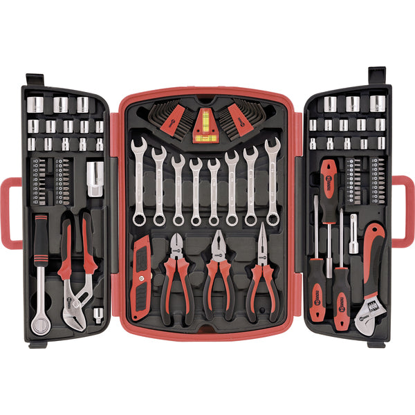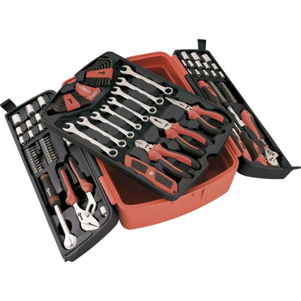 Conteúdo da embalagem 1 Jogo de ferramentas, composto por uma maleta plástica com bandeja para ferramentas, com 112 peças em aço carbono, sendo: 3 soquetes sextavados encaixe quadrado 3/8" (14 mm, 17 mm e 19 mm), 3 soquetes sextavados encaixe quadrado 3/8" (5/8", 11/16" e 3/4"), 1 soquete sextavado longo encaixe quadrado 3/8" (21 mm), 1 extensão encaixe quadrado 3/8" - comprimento 70 mm, 1 catraca reversível encaixe 3/8" - comprimento 8", 1 adaptador encaixe quadrado 3/8" para encaixe quadrado 1/4", 10 soquetes sextavados encaixe quadrado 1/4" (4 mm, 5 mm, 6 mm, 7 mm, 8 mm, 9 mm, 10 mm, 11 mm, 12 mm e 13 mm), 10 soquetes sextavados encaixe quadrado 1/4" (5/32", 3/16", 1/4", 9/32", 5/16", 11/32", 3/8", 7/16", 15/32" e 1/2"), 1 adaptador sextavado/quadrado 1/4", 1 cabo adaptador encaixe sextavado 1/4", 4 bits/ponteiras allen (3 mm, 4 mm, 5 mm e 6 mm), 5 bits/ponteiras hexalobular (T10, T15, T20, T25 e T30), 10 bits/ponteiras pozidrive (PZ0 (2 peças), PZ1 (2 peças), PZ2 (3 peças) e PZ3 (3 peças)), 10 bits/ponteiras phillips (PH0 (2 peças), PH1 (2 peças), PH2 (4 peças) e PH3 (2 peças)), 10 bits/ponteiras fenda simples (3 mm (2 peças), 4 mm (2 peças), 5 mm (2 peças), 6 mm (2 peças) e 7 mm (2 peças)), 12 chaves allen (0,90 mm (2 peças), 1,72 mm (2 peças), 1,5 mm, 2,0 mm, 2,5 mm, 3,0 mm, 3,5 mm, 4,0 mm, 5,0 mm e 6,0 mm), 12 chaves allen (0,036" (2 peças), 0,05" (2 peças), 1/16", 5/64", 3/32", 7/64", 1/8", 9/64", 5/32" e 3/16"), 8 chaves combinadas (10 mm, 12 mm, 13 mm e 14 mm, 3/8", 7/16", 1/2" e 9/16"), 1 alicate universal 6", 1 alicate de corte diagonal 6", 1 bico meia-cana 6", 1 chave de fenda 1/4" x 4", 1 chave phillips (PH2 - 1/4" x 4"), 1 chave ajustável 7.1/2" - abertura 27 mm, 1 alicate bomba d'água - abertura 24 mm, 1 nível mini (vertical e horizontal) e 1 estilete trapezoidal 8" (corpo metálico) Aplicações e dicas de uso Indicado para manutenções e reparos em geral. Uso leve. Destaques e diferenciais Proporciona maior praticidade, pois com apenas 1 jogo de ferramentas é possível realizar uma série de trabalhos
