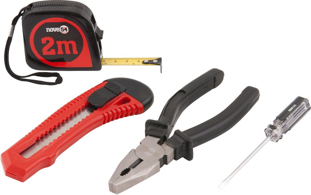 Conteúdo da embalagem 1 Jogo de ferramentas com 4 peças, sendo: 1 estilete 18 mm, 1 alicate universal aço carbono 6", 1 chave de fenda aço carbono 1/8" x 3" e 1 trena 2 m Aplicações e dicas de uso Indicado para manutenções e reparos em geral. Uso leve.