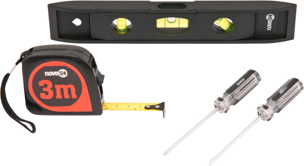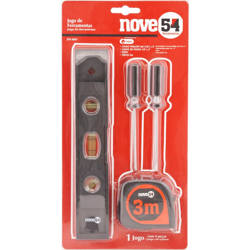 Conteúdo da embalagem 1 Jogo de ferramentas com 4 peças, sendo: 1 nível plástico 9", 1 chave de fenda aço carbono 1/8" x 3", 1 chave de fenda cruzada/phillips aço carbono 1/8" x 3" e 1 trena 3 m Aplicações e dicas de uso Indicado para manutenções e reparos em geral. Uso leve.