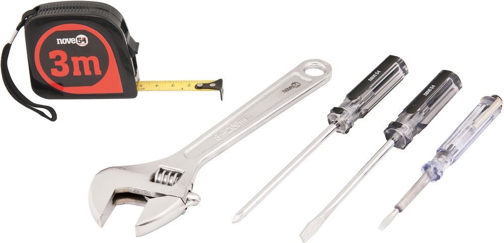 Conteúdo da embalagem 1 Jogo de ferramentas com 5 peças, sendo: 1 chave de fenda aço carbono 3/16" x 4", 1 chave de fenda cruzada/phillips aço carbono 3/16" x 4", 1 chave ajustável aço carbono cromada 8", 1 chave teste 1/8" x 5.1/2" e 1 trena 3 m Aplicações e dicas de uso Indicado para manutenções e reparos em geral. Uso leve.