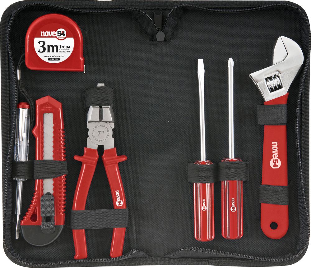 Conteúdo da embalagem 1 Jogo de ferramentas com 8 peças, sendo: 1 estojo em lona, 1 trena 3 m, 1 chave teste 1/8" x 5.1/2", 1 estilete 18 mm, 1 chave de fenda em aço carbono 6 mm x 100 mm, 1 chave de fenda cruzada/phillips em aço carbono 6 mm x 100 mm, 1 alicate universal em aço carbono 7" e 1 chave ajustável em aço carbono cromada 8" Aplicações e dicas de uso Indicado para manutenções e reparos em geral. Uso hobby/doméstico. Destaques e diferenciais Acompanha prático estojo com zíper e acomodações para todas as ferramentas