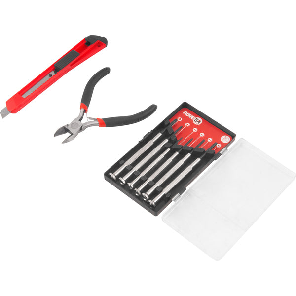 Conteúdo Embalagem:1 Jogo de ferramentas com 8 peças, sendo: 1 alicate corte diagonal em aço carbono de 4.1/2", 1 estilete de 9 mm , 6 chaves de precisão em aço carbono (2 phillips (PH1 e PH0) e 4 fenda (1,4 mm, 2 mm, 2,4 mm e 3 mm))
