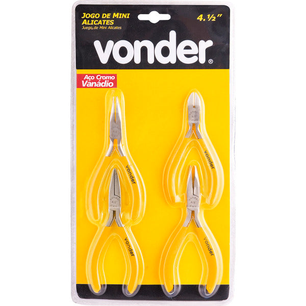 Conteúdo da embalagem 1 Jogo de minialicates, composto por 4 peças, sendo: 1 alicate de corte diagonal 4.1/2", 1 alicate de bico meia-cana reto 4.1/2", 1 alicate de bico meia-cana curvo 4.1/2" e 1 alicate de bico chato 4.1/2" Aplicações e dicas de uso Indicado para uso geral em eletrônica Destaques e diferenciais Produzido em aço cromo vanádio, proporcionando maior resistência e durabilidade. Possui abertura controlada por lâminas de efeito mola, conferindo menor esforço ao operador.