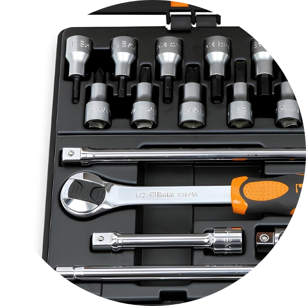 O jogo de soquetes e acessórios, apresentado em um estojo metálico resistente, oferece uma variedade de ferramentas essenciais para suas necessidades de trabalho. Com uma seleção abrangente de soquetes e acessórios, este conjunto é ideal para uma ampla gama de aplicações.