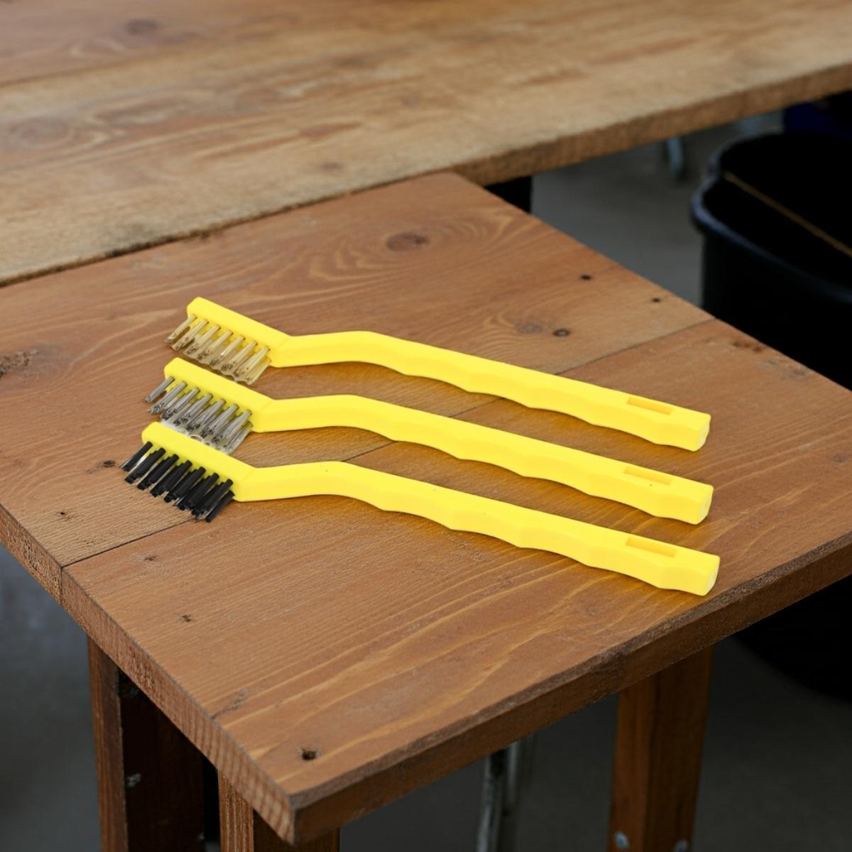 A escova com cerdas de aço inox é indicada para remoção de ferrugem, sujeiras pesadas e incrustações em superfícies metálicas. Já a escova de latão proporciona uma limpeza eficiente sem agredir materiais mais sensíveis, sendo ideal para acabamentos. Por sua vez, a escova de nylon é perfeita para limpezas mais leves e delicadas, em superfícies que exigem cuidado extra.