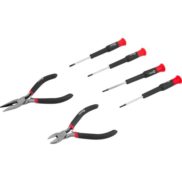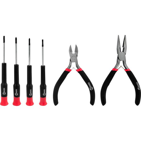 1 Jogo de ferramentas com 6 peças, sendo: 1 alicate corte diagonal em aço carbono de 4.1/2", 1 alicate bico meia cana reto em aço carbono de 4.1/2", 2 chaves de fenda de precisão em aço carbono (2,5 mm e 3,0 mm) e 2 chaves phillips de precisão em aço carbono (2,5 mm e 3,0 mm)