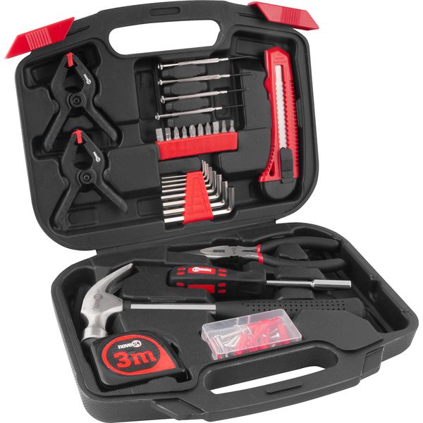 1 Jogo de ferramentas composto por: 1 maleta plástica com 89 peças sendo: 1 alicate de bico 6" em aço carbono, 1 estilete de 18 mm, 3 bits fenda em aço carbono (3 mm, 4 mm e 6 mm), 3 bits phillips em aço carbono (PH1, PH2 e PH3), 2 bits pozidrive em aço carbono (PZ0 e PZ1), 2 bits allen em aço carbono (H5 e H6), 1 cabo adaptador 1/4" em aço carbono (possui compartimento para guardar bits), 1 trena de 3 m, 8 chaves allen em aço carbono (1,5 mm - 2,0 mm - 2,5 mm - 3,0 mm - 4,0 mm - 5,0 mm - 5,5 mm e 6,0 mm), 1 martelo 23 mm, 4 chaves de precisão em aço carbono (fenda 2 mm e 2,5 / phillips PH0 e PH1), 2 grampos multiuso com mola de 86 mm e 1 porta acessórios com 59 peças (5 alfinetes, 5 buchas de 6 mm, 5 parafusos phillips 4 mm x 19 mm, 39 pregos 7 x 20 e 5 ganchos)