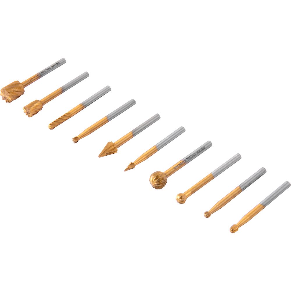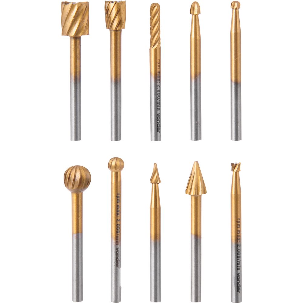 Utilizadas para desbastar, modelar e esculpir madeira, resina acrílica, PVC e metais macios (exemplos: alumínio, bronze, latão, cobre, entre outros), além de realizar acabamentos e remoção de rebarba. Rotação máxima (rpm): 28.000/min