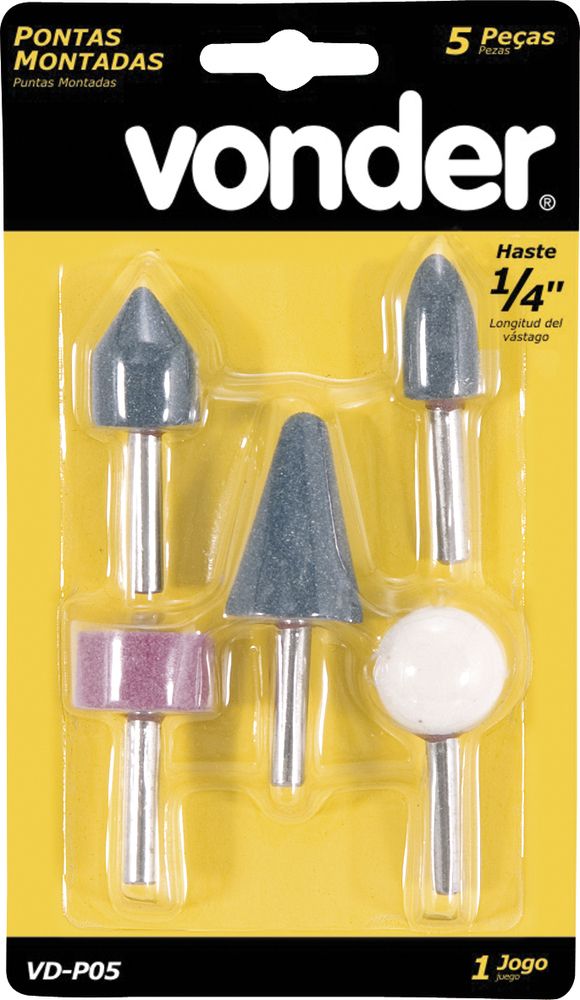 Conteúdo da embalagem 1 Cartela com 5 peças, sendo: 3 cônicas, 1 cilíndrica e 1 esférica com haste de 6 mm Aplicações e dicas de uso Indicado para retificar e desbastar pequenas peças em ferramentaria, fundições, rebarbação de furos e entalhes de difícil acesso Destaques e diferenciais Possui formato que facilita o trabalho em locais de difícil acesso. Ponta (rebolo) fabricada em óxido de alumínio que confere maior vida útil.